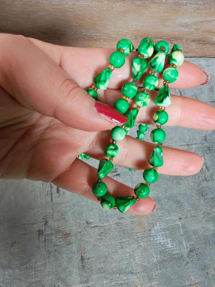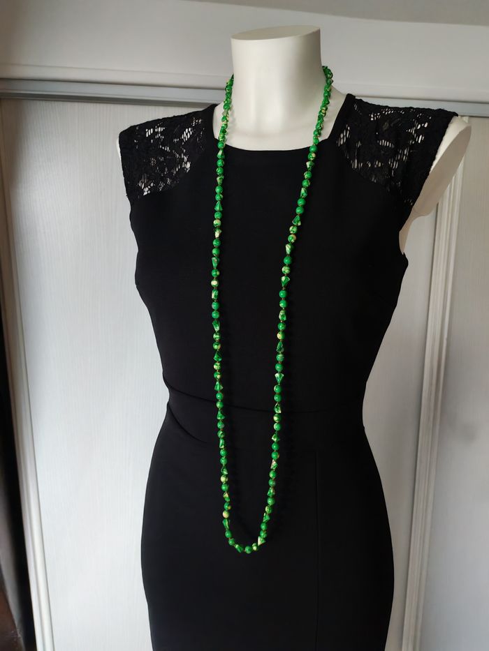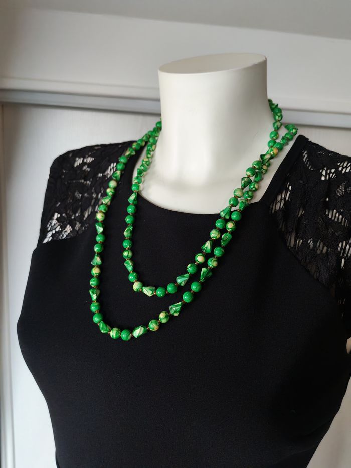 Sautoir petits pois de perles vertes vintage. Joli sautoir de perles en plastique reouvertes d'autocollant de couleur verte, par endroit il est décollé ou parti, le collier este en bon état général, s'enfile, n'a pas de fermoir. Peut être nouer devant ou porter en double tours autour du cou ou en tant que bracelet plusieurs tours autour du poignet. Belle pièce vintage. Dimensions : Longueur/tour : 126 cm Taille des perles : 8 -10 mm Poids : 34g