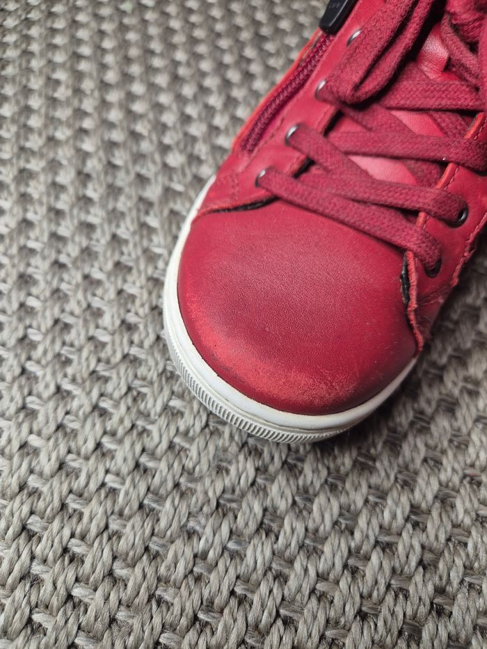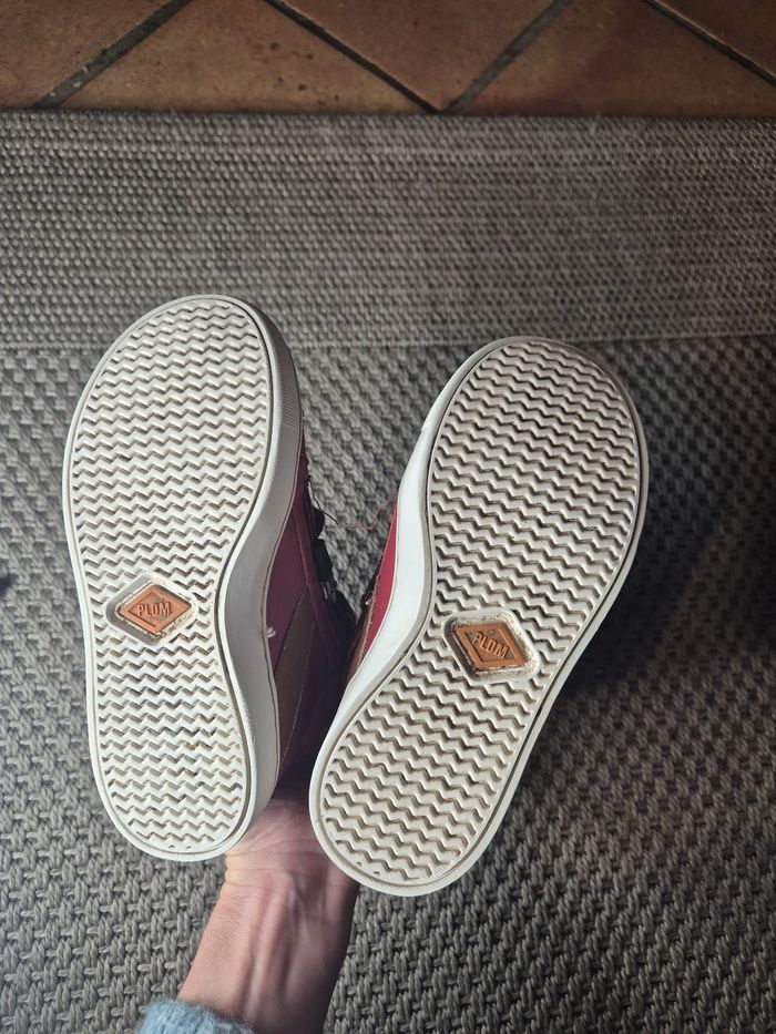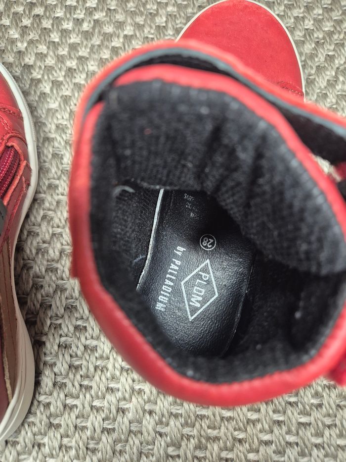 Chaussures montantes idéales pour l'hiver. Couleur rouge peu portées. Lacets mais s'enfilent facilement avec une fermeture éclair sur le coté. bon état. Quelques griffures voir les photos. Semelles en très bon état. Bon maintient du pied. Taille 28 - marque PLDM by Palladium