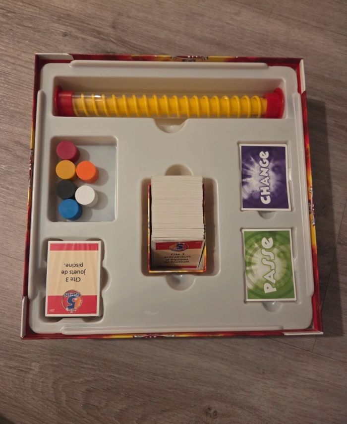 Jeu 5 secondes Les pions ont été remplacés 1 carte manque mais n'empêche pas de jouer 1 paquet de cartes encore sous plastique Notice manquante mais imprimée depuis internet