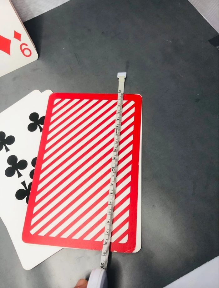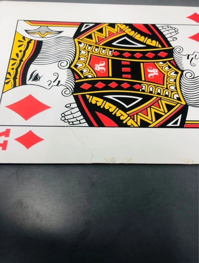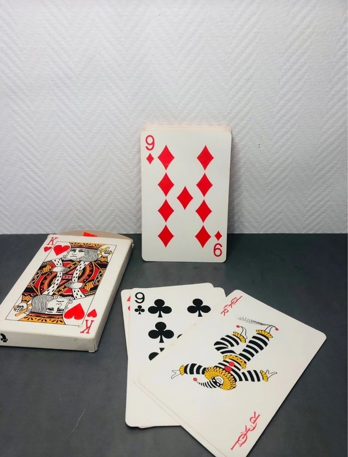 Jeu de cartes XXL. - Type de produit : Jeux de société - Âge recommandé : 7 ans et + En très bon état, le roi de carreaux est légèrement abîmée Boite légèrement abîmée Complet Dimensions en photos