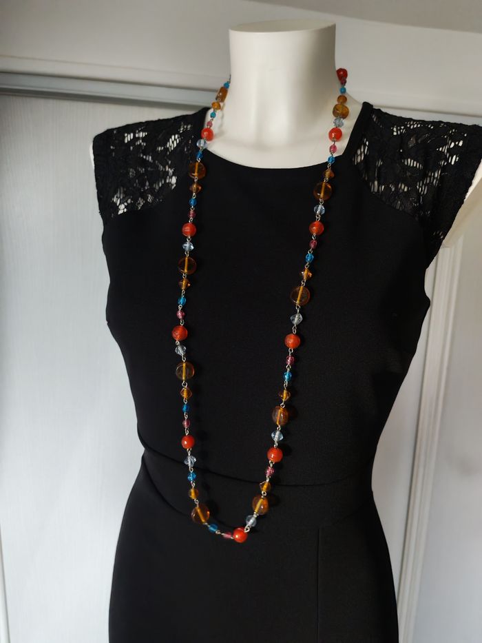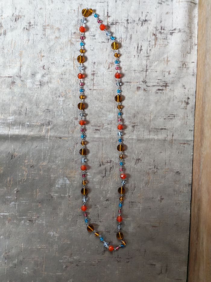 Sautoir de perles de verre multicolor vintage. Le sautoir est en très bon état, avec des perles de couleur, de taille et de forme différentes, peut-être porté comme collier en faisant deux tour de cou. Belle pièce vintage, sans fermoir, s'enfile. Dimensions : Longueur/tour : 104 cm Taille des perles : 6mm-13 mm Poids : 83g