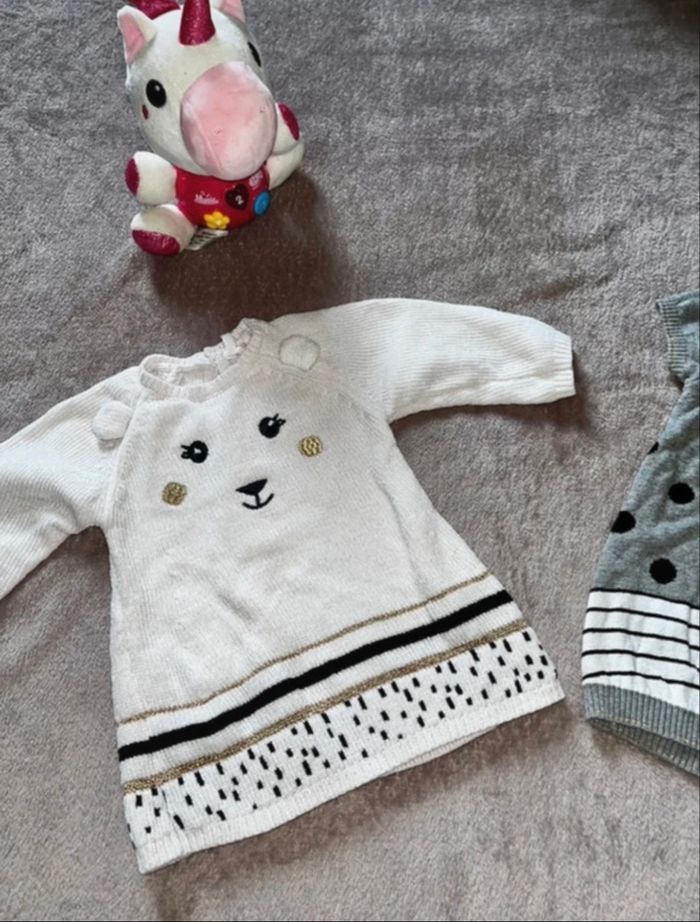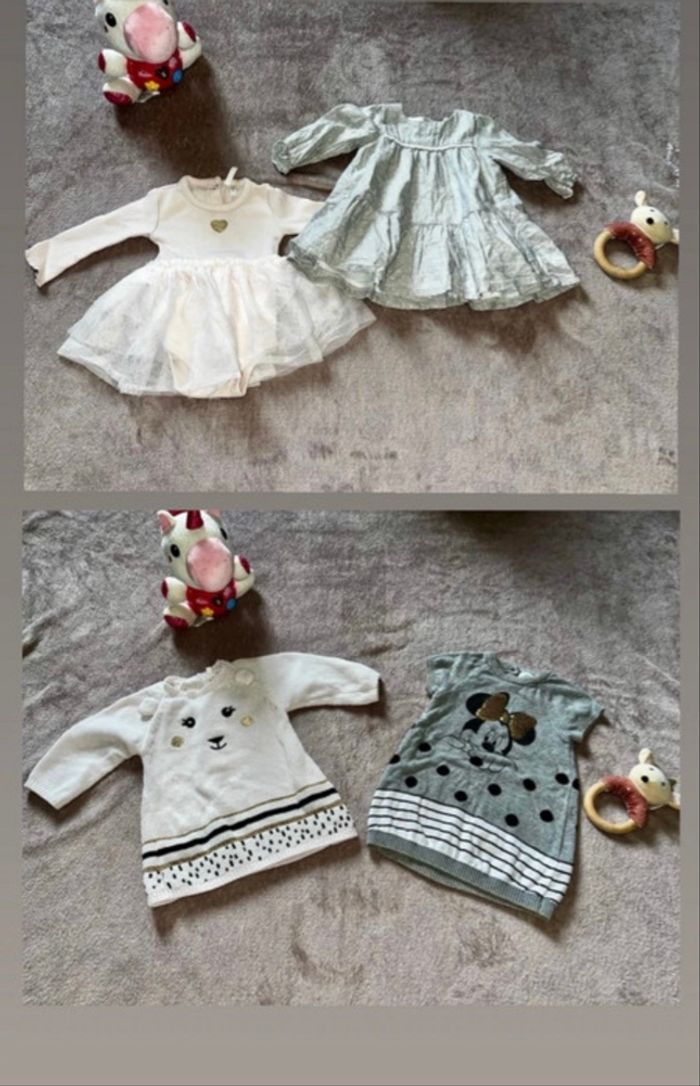 Lot de 4 robes Lot robes taille 1 et 3 mois Robe rose taille 3mois → Orchestra Robe grise taille 1mois → Orchestra Deux robes PULL taille 6mois → Orchestra → Disney