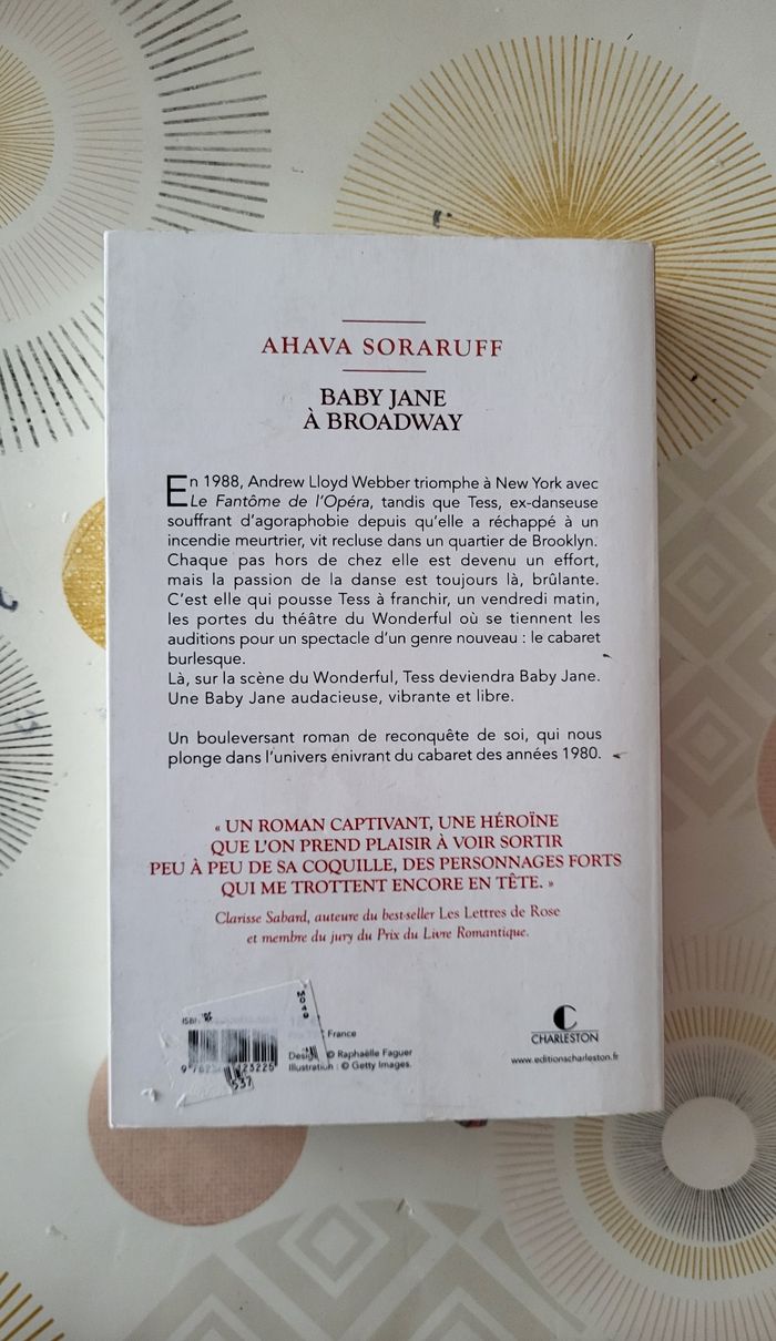 📚Baby Jane à Broadway par Ahava Soraruff-Grand Format en BE📚 *ISBN : 9782368123225 *Editeur : Charleston/France Loisirs *Etat : TBE *Prix : Le coup de cœur du prix du livre romantique Résumé : En 1988, Andrew Lloyd Webber triomphe à New York avec Le Fantôme de l'Opéra, tandis que Tess, ex-danseuse souffrant d'agoraphobie depuis qu'elle a réchappé à un incendie meurtrier, vit recluse dans un quartier de Brooklyn. Chaque pas hors de chez elle est devenu un effort, mais la passion de la danse est toujours là, brûlante. C'est elle qui pousse Tess à franchir, un vendredi matin, les portes du théâtre du Wonderful où se tiennent les auditions pour un spectacle d'un genre nouveau : le cabaret burlesque. Là, sur la scène du Wonderful, Tess deviendra Baby Jane. Une Baby Jane audacieuse, vibrante et libre. ......