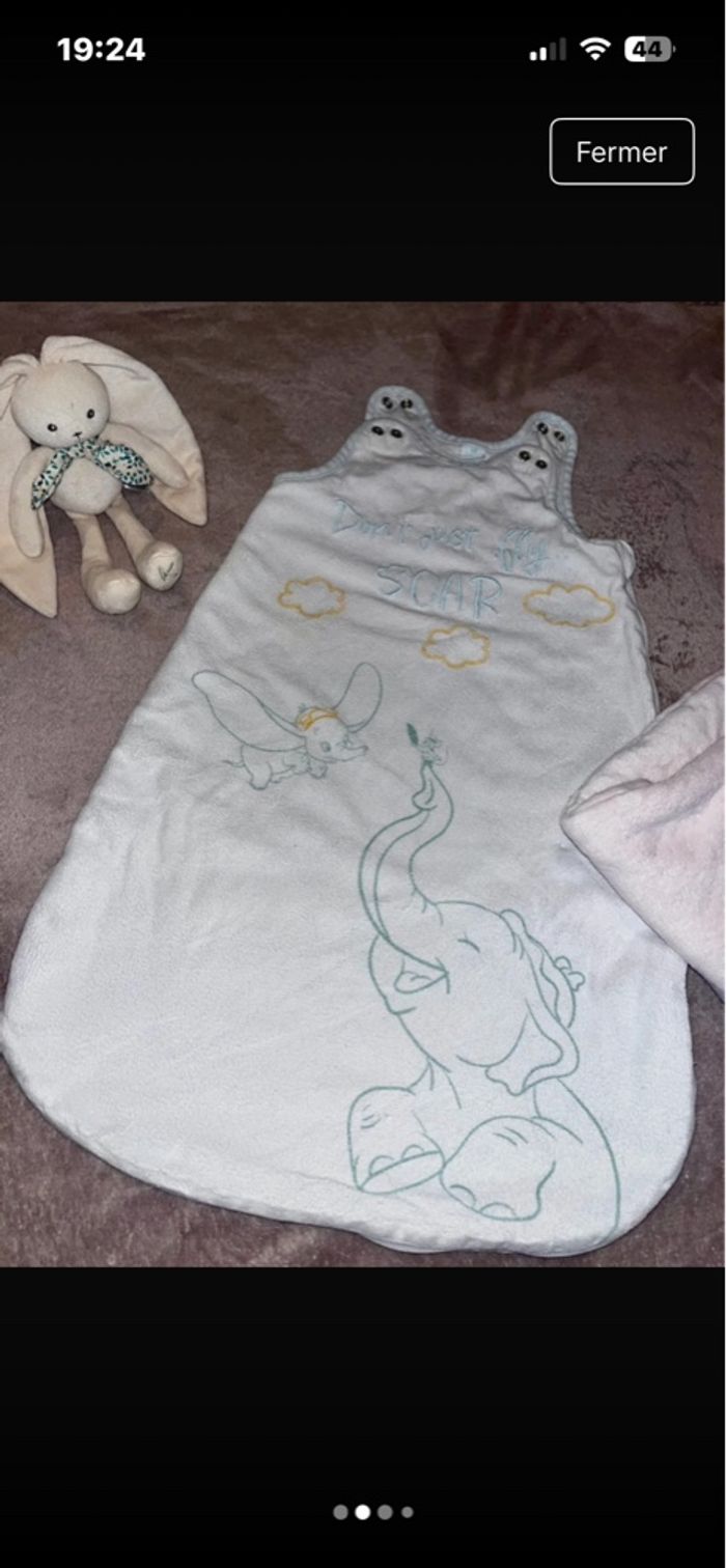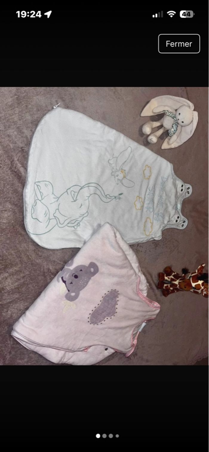 Lot de 2 gigoteuse →Gigoteuse DISNEY taille 0-6mois TOG 3 Deux pression sur chaque épaule Fermeture éclair →Gigoteuse MOTS D'ENFANTS taille 0-18mois TOG 2 ajustable 0-6mois grâce au pressions au dos ( voir photo ) Fermeture éclair AUCUNE TACHE TRÈS BON