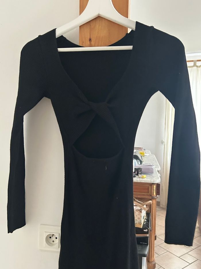 Robe noir manche longue taille XS, acheter sur le site kameli boutique, dos nu avec un noeud et une fente sur le côté Envoie rapide et efficace 🌸📦