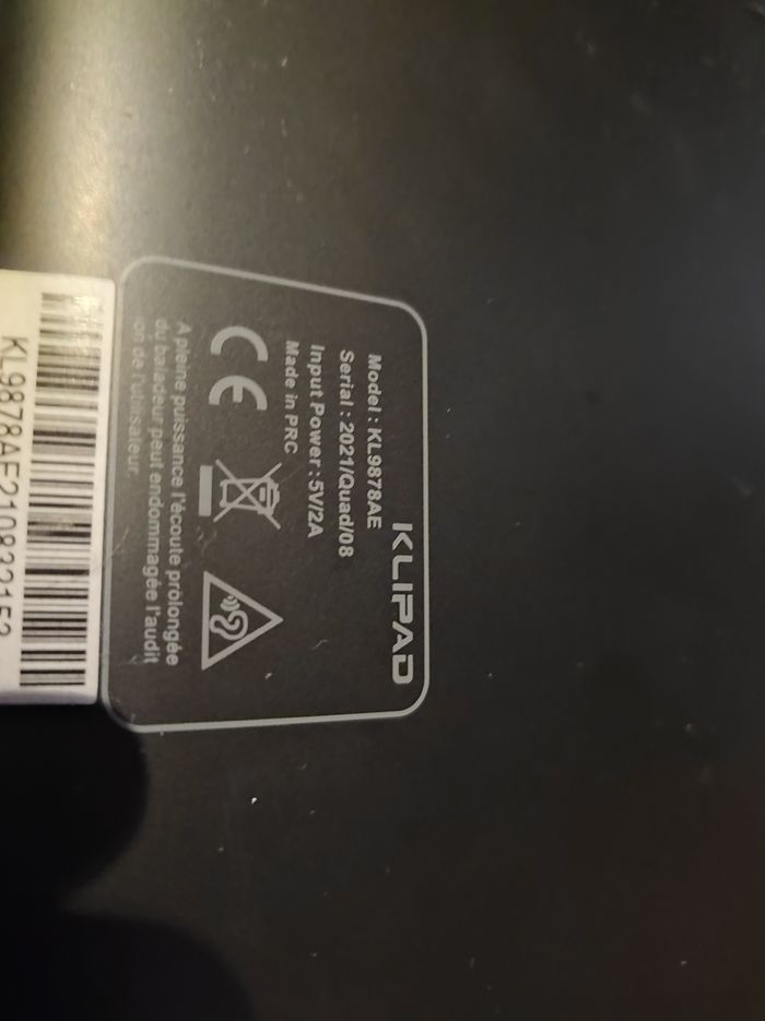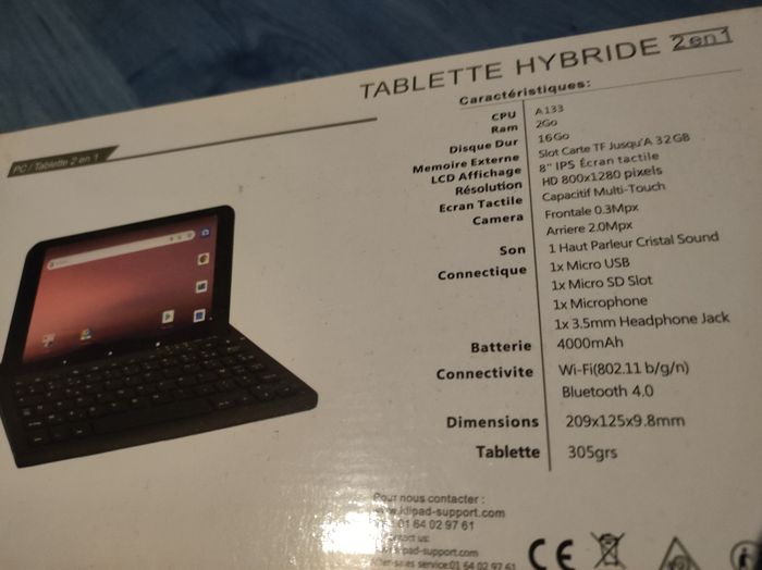 Je vends cette tablette de la marque Klipad Modèle KL9878 Occasion, quelques traces d'usure et micro rayure sur l'écran Fonctionne parfaitement, il a été réinitialiser d'usine pour la vente . CHARGEUR FOURNI Tablette de 8" sous Android 12 Navigation sur le web via wifi, consultation d'emails et de vidéos. Mémoire interne de 16GO, 2GO de RAM, entrée carte micro SD Autonomie de 3 à 5 heures. Remise en main propre possible sur mulhouse et environs, ou envoie express et soignée CARACTERISTIQUES : ype Details Descriptions Produit Fonctions Produits Tablette Finition noir Ecran Taille écran 8'' Résolution 1280 X 800 Pixels Batterie Type Lithium-ion polymer batterie Capacité 5000 Mah Utilisation 3- 5 Heures Système et Configuration Type Details Descriptions CPU Type CPU A133 RAM Capacité 2 GB ROM Capacité 16GB Camera Frontale Arriere 0.3MP 2MP Haut parleurs Type 1 Haut-parleurs cristal sound Réseaux et Communications Type Details Descriptions WIFI Module WIFI BT Bluetooth 5.0 BT 4.0 Prises et connectivité Type Details Descriptions Mémoire Mémoire externe Slot Carte micro TF Prises écouteurs 3.5mm alimentation Sur prise micro USB Clavier AZERTY Micro Interne Accessoires Type Details Descriptions Chargeur Puissance DC/5V/2A - USB Système d'exploitation Type Details Descriptions OS OS ANDROID 12 Paxck office sur application Google play Dimensions et poids Dimensions Dimensions 209x125x9.8mm Poids 305 grs Normes legales CE / ROHS / REACH / RED DAS 0,47a