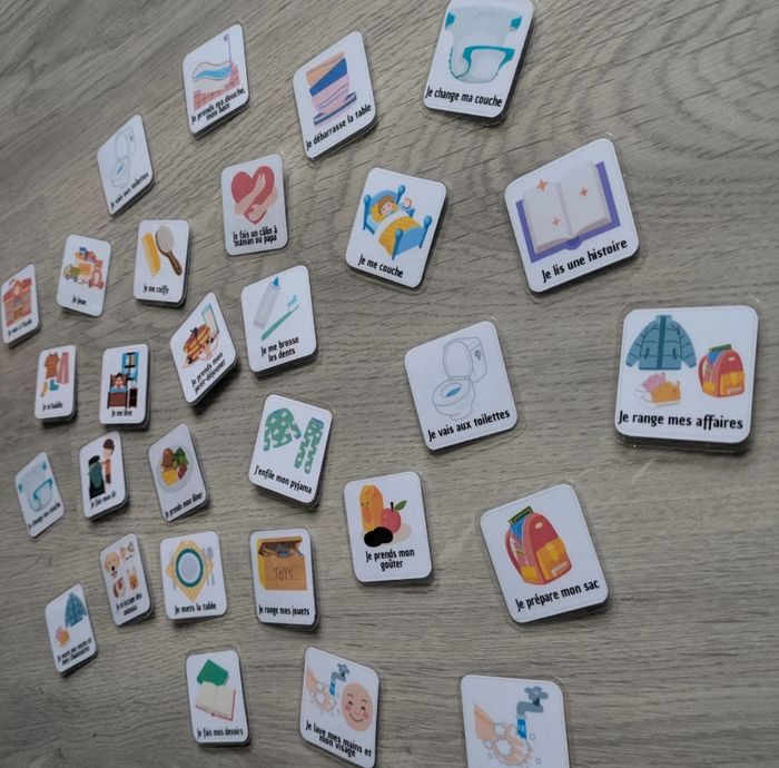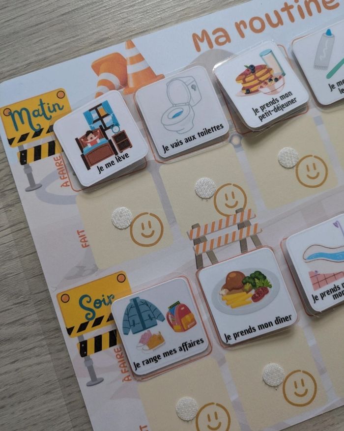 Aidez votre enfant à structurer sa journée avec plaisir et autonomie. Ce tableau de routine sur le chantier transforme les habitudes du quotidien en un jeu visuel, simple et motivant, favorisant confiance, repères et responsabilisation. ❓ Pourquoi adopter une routine visuelle ? 🔸 Encourage l’autonomie dès le plus jeune âge 🔸 Apaise les transitions (matin, repas, coucher, école…) 🔸 Réduit le stress et les conflits du quotidien 🔸 Renforce la confiance en soi grâce à un suivi concret 🔸 Permet aux parents de gagner du temps et de la sérénité 🔸 Idéal pour la maison, la crèche et l’école ✅ Contenu du kit 🔸 1 tableau format A4 engins de chantier et tractopelle 🔸 30 vignettes à scratch représentant les moments clés de la journée (toilette, repas, jeux, école, coucher…) 📋 Caractéristiques 🔸 Format du tableau : A4 🔸 Taille des vignettes : env. 4 × 4 cm 🔸 Papier épais : 200 g/m² (tableau) / 160 g/m² (vignettes) 🔸 Plastification résistante : 125 × 2 microns 🔸 Scratchs solides 10 mm 📝 Vignettes incluses Je mets ma veste et mes chaussures Je vais aux toilettes X2 Je lave les mains et mon visage Je me brosse les dents x2 Je prends ma douche, mon bain Je me coiffe Je m'habille Je prends mon petit déjeuner Je me lève J'enfile mon pyjama Je fais un câlin à maman ou papa Je me couche Je change ma couche X2 Je prends mon dîner Je me lave les mains Je range mes jouets Je m'occupe des animaux Je fais mon lit Je lis une histoire Je débarrasse la table Je joue Je prépare mon sac Je range mes affaires Je vais à l'école Je prends mon goûter Je mets la table Je fais mes devoirs 🧷 Fixation murale non incluse 🌈 Support durable, réutilisable, d’inspiration Montessori, pensé pour accompagner l’enfant vers plus d’autonomie à son rythme. 📬 Envoi rapide et soigné 💬 N’hésitez pas à me contacter pour toute question 😊