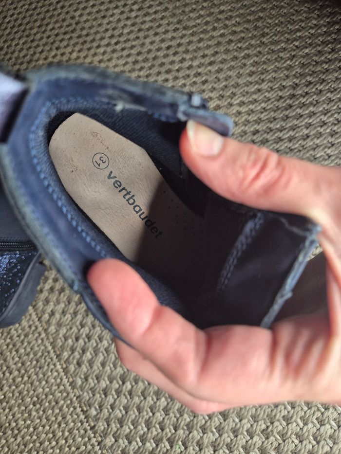 Bottines neuve bleu marine. Taille 31. Marque vertbaudet. Achetées neuve en magasin. Portée 1 fois pour 1 occasion. Défauts : pliure et 1 tâche a nettoyer.