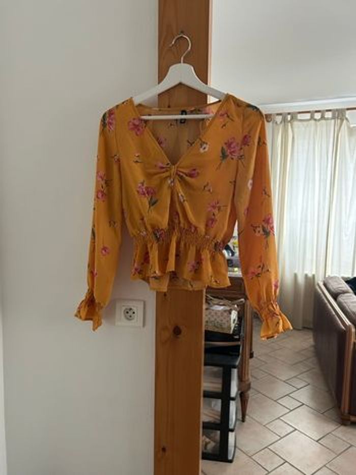 Blouse manche longue jaune/orange fleuri, taille XXS Envoie rapide et efficace 🌸📦