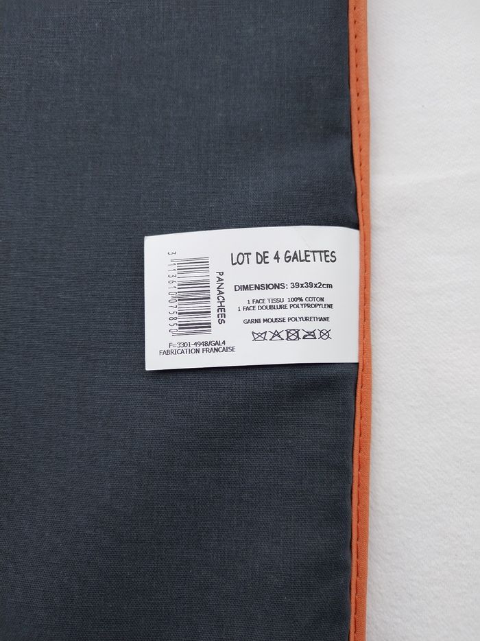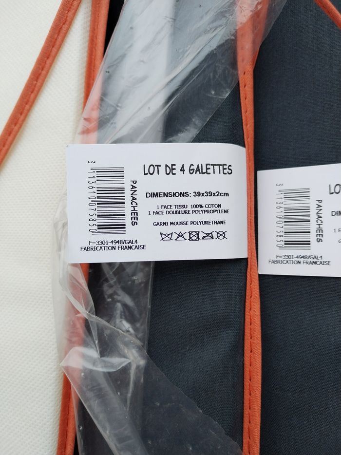 Lot de 4 galettes de chaise (coussins d'assise) de couleur noir avec un liseré orange contrastant. Parfait pour ajouter du confort et une touche de couleur à votre salle à manger ou votre terrasse ​État : comme neuf, encore emballé et étiquettes bien lisibles ​Dimensions : 39 x 39 x 2 cm ​Composition : ​Face tissu : 100% Coton ​Face doublure : Polypropylène ​Garnissage : Mousse Polyuréthane ​Qualité : Fabrication Française ​Pratique : Présence de liens d'attache pour fixer les galettes aux dossiers des chaises 📦 Envoi rapide