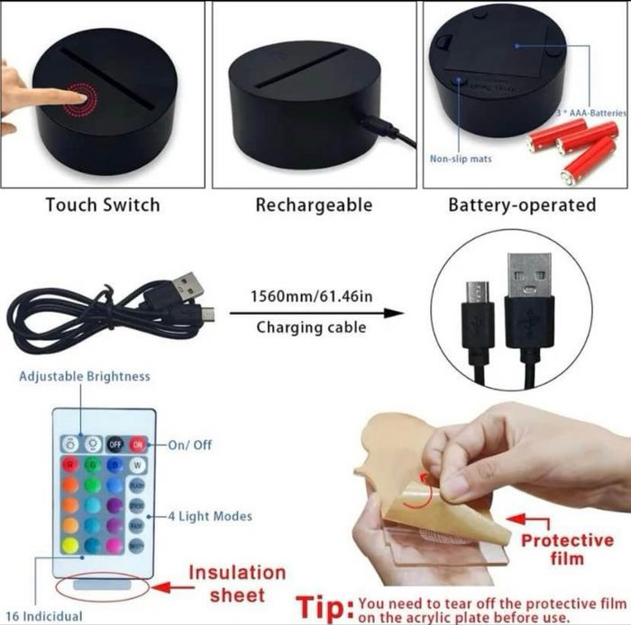 3 dessins différents au choix. Le dessin sera net comme sur les photos quand vous aurez enlevé le film protecteur. 🎈Largeur : 13,5 cm 🎈Hauteur sans le socle : 17 cm 🎈Hauteur avec le socle : 21 cm ⭐️ Changement de 7 couleurs : rouge, vert, bleu, jaune, cyan, violet et blanc. Peut fixer une couleur ou 16 couleurs changeantes progressives. ⭐️ Appuyez sur le bouton tactile pour changer les couleurs ou avec la télécommande. Maintenez le bouton enfoncé pour l’éteindre. ⭐️ Faible consommation, la source de lumière utilise la LED de haute qualité, la lumière est douce et ne blesse pas les yeux. ⭐️ Panneau acrylique optique qui donne un effet 3D lorsqu'il est éclairé. ⭐️ Alimentation avec 3 piles AA (non incluses) ou connection USB sur secteur (recommandée), Câble USB de 80 cm inclus. ⭐️ Veuillez retirer le film protecteur avant utilisation.