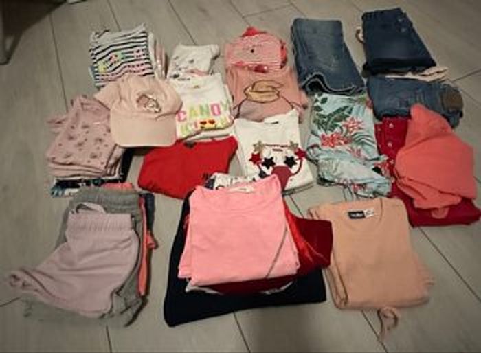 Lot vêtements fille -1 robe pull -1 robe rouge paillette( léger ) -2 jupes -1jeans -1 salopette robe -1 salopette short -3 petit pull -1 croc top pull -1 pyjama -2 croc top manche court -1 casquette -1 ensemble short -6 débardeur -8 maillot -4 short -1 robe épaisse -2 robes 1 habillé 1 plage Lot de 39 pièces Différente marque (tape à l œil, Kiabi, orchestra, okaidi