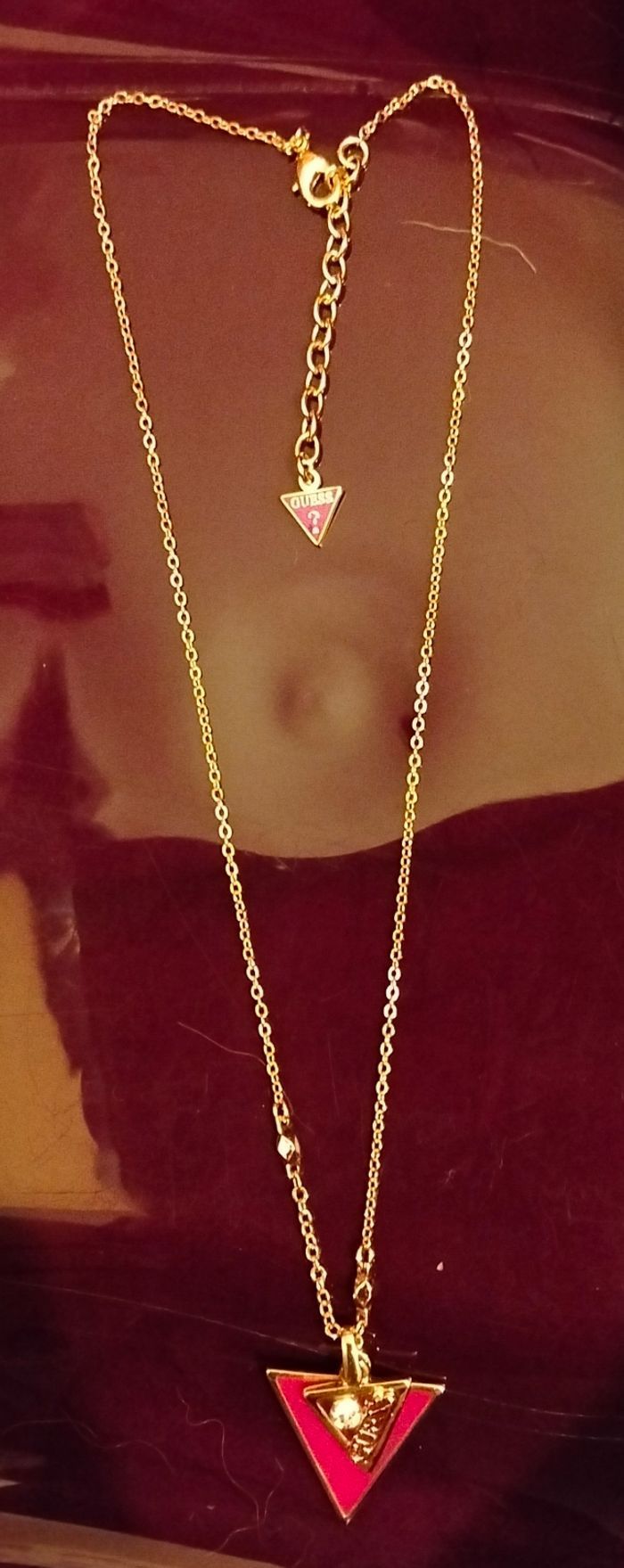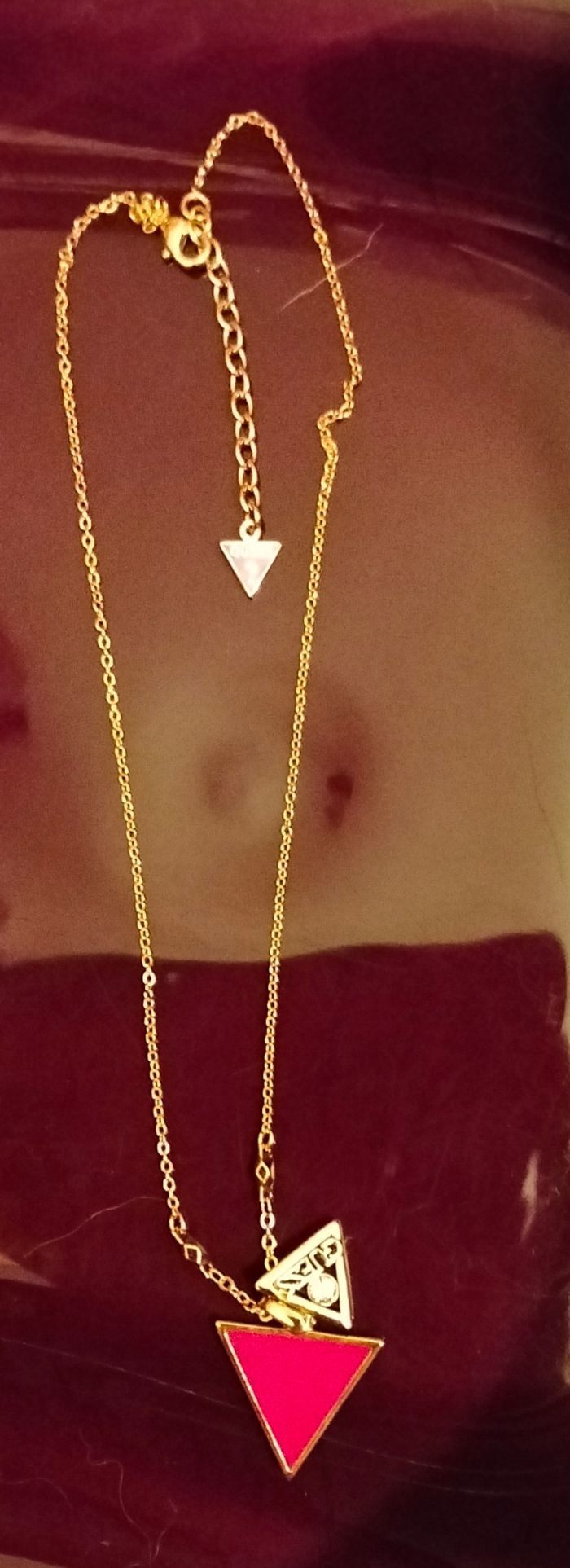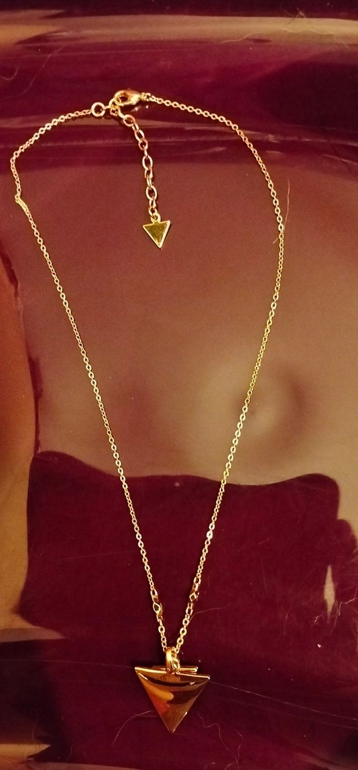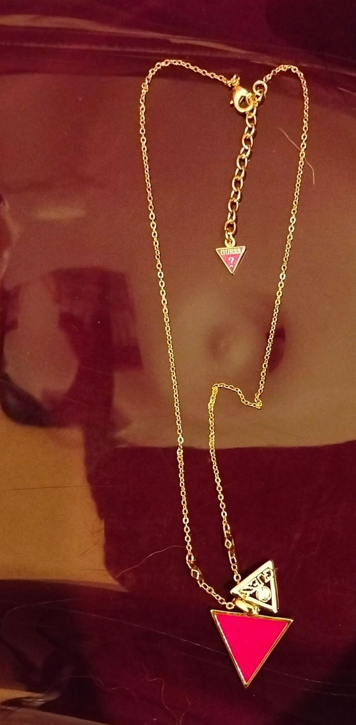 Bonjour je vends ce collier doré Guess pendentif triangle email rose dessus un petit triangle avec un strass reçu en cadeau mais ne me plaît pas . Vendu avec son pochon