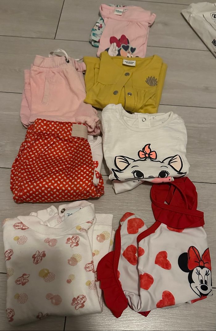 Lot vêtements 18 mois 9 pièces -2 maillots -1 maillot de bain -1 gilet -1 petit pull -1 ensemble short été -1 ensemble pantalon printemps -2 shorts Lot vêtement fille 18 mois 9 pièces Marque (orchestra, okaidi, tape à l’œil,Disney