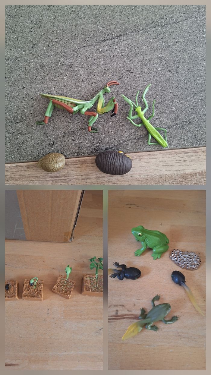 Lot figurines Figurine tres bon etat Cycle de vie plante grenouille et mante religieuse Materiel pédagogique pour sequence educative sur le thème du développement animal Utilisé aussi en bac sensoreil Assistante maternelle montessori Eveil bebe motricité materiel pédagogique educatif tickit hoptoys