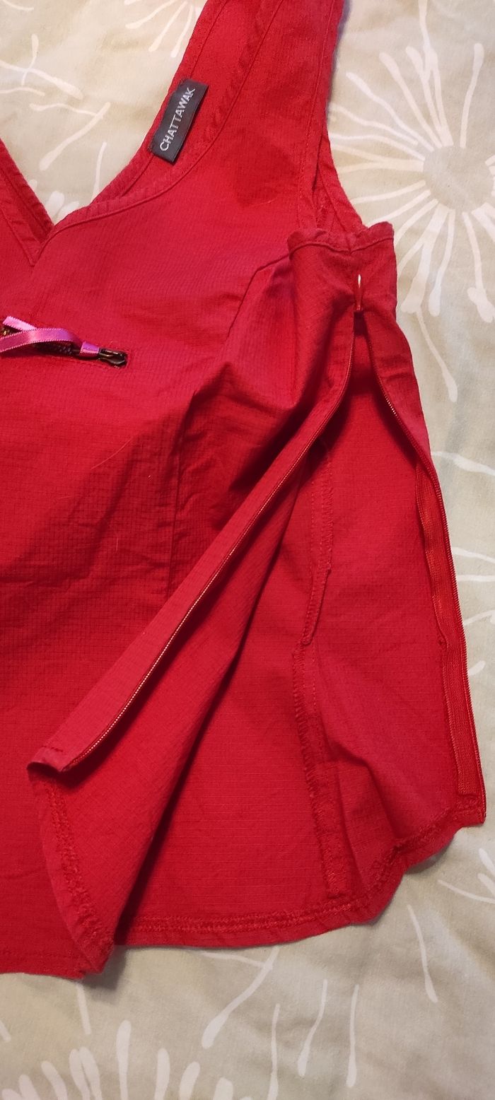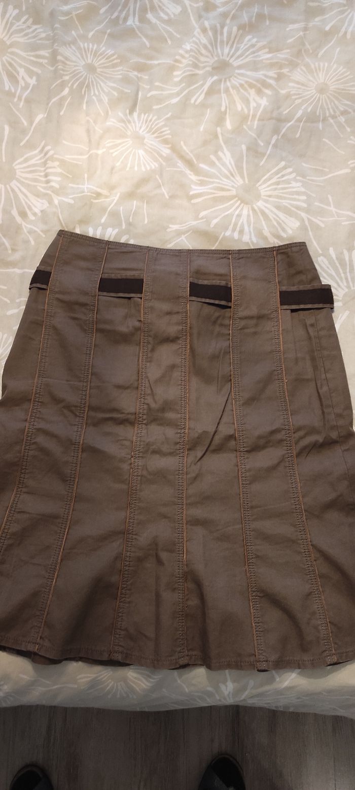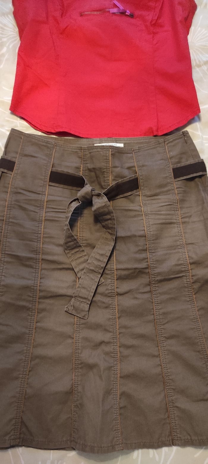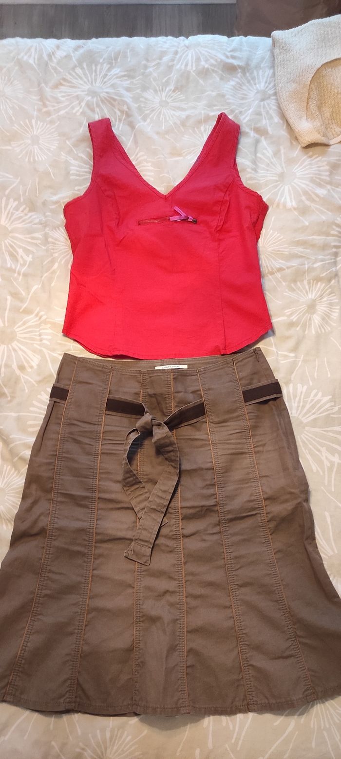 Ensemble top et jupe Débardeur rouge avec bretelles, poche sur le devant, en coton et elasthane, s'ouvre avec fermeture éclair sur le côté Jupe marron avec ceinture , s'ouvre aussi avec fermeture éclair sur le côté Taille S Les deux en parfait état Pensez aux lots : réductions activées