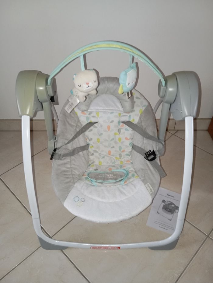 Peu servie Très bon état: à noter que le plastique gris du portique a jauni par endroit (voir photo) mais sinon fonctionne parfaitement, assise avec appui tête dans un état impeccable (ni trou ni tâche ni accroc), arche de jeux amovible en excellent état Complet, vendue avec sa notice sans emballage d'origine ✓ Peu encombrant - à la maison et en voyage ✓ TrueSpeed™ - adapte la vitesse ✓ Avec 8 mélodies Ingenuity™ Balancelle compacte Fanciful Forest Se balancer avec un maximum de confort - à tout moment et partout. Cette balancelle portable compacte pour bébé ne prend que peu de place dans la maison. Une multitude de fonctions comme 2 positions de couchage, un arceau de jeu amovible avec 2 adorables peluches et la toute dernière technologie qui garantit une expérience particulièrement relaxante. La technologie TrueSpeed™ détecte le poids et veille à ce que les 6 vitesses de balancement restent identiques, même si le bébé devient plus lourd. La minuterie de la balancelle peut être réglée sur 30, 45 et 60 minutes. Calmez votre bébé avec 8 mélodies dont le volume est réglable. Le design du cadre Slimfold™ permet de plier facilement la balancelle pour la transporter d’une pièce à l’autre et la ranger de manière peu encombrante. Si l’appuie-tête et le coussin d’assise sont devenus un peu sales, il suffit de les enlever et de les laver dans la machine à laver. Un harnais à 5 points et des pieds antidérapants assurent un maximum de sécurité. Superbe balancelle peu encombrante pour la maison et les voyages 8 mélodies avec réglage du volume et fonction d’arrêt automatique Siège Comfort Recline™ avec 2 positions différentes La technologie TrueSpeed™ maintient les 6 vitesses de balancement constantes à mesure que le poids du bébé augmente Arceau de jeu amovible avec 2 peluches. Coussin d’assise et appui-tête lavables en machine Marche sur piles : piles non fournies Capacité de charge : jusqu’à 9 kg Âge recommandé : 0-9 mois