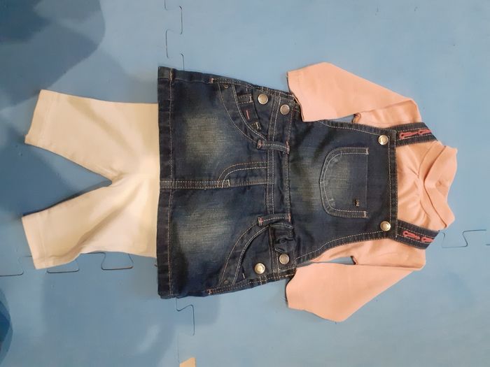 Vends robe salopette en jean + tee-shirt manches longues avec petit col + legging 3/4, 3mois