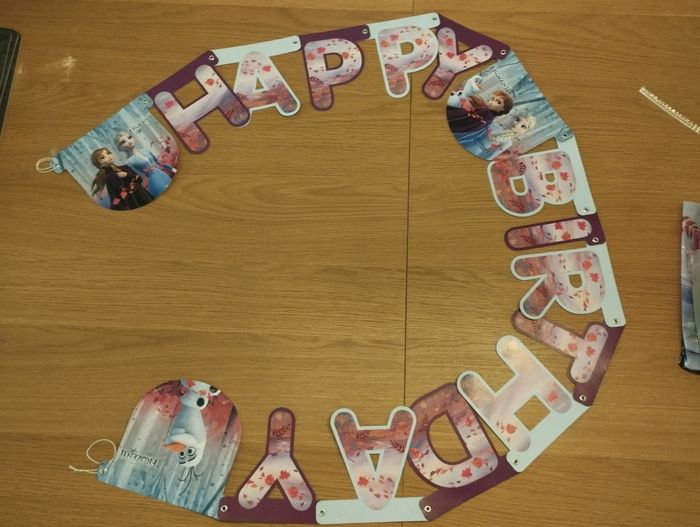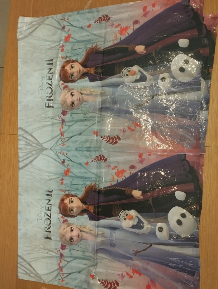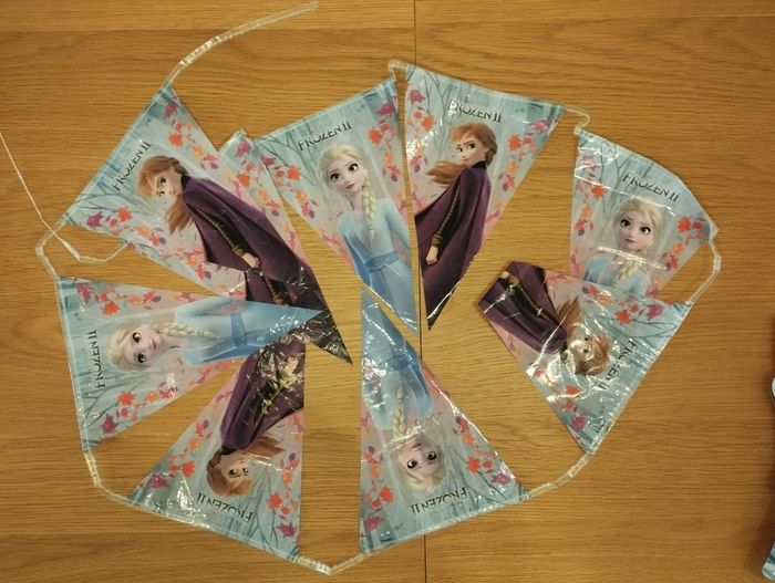 Décoration reine des neiges comprenant banderole happy birthday, banderole avec des fanions et une nappe (légèrement abîmé)