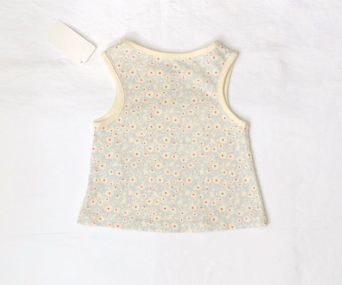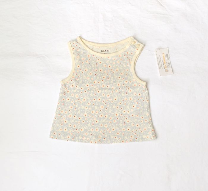 Haut à bretelles Kiabi, Taille 3 mois/ 60 cm. Mignon et très agréable à porter l’été. En coton bleu ciel, motifs petites fleurs de couleur crème et rouge. Ouverture par boutons sur l’épaule gauche. Neuf avec étiquette. 🌸 Vous aimez cet article ? N’oubliez pas de visiter le reste de mon dressing en filtrant les tailles.