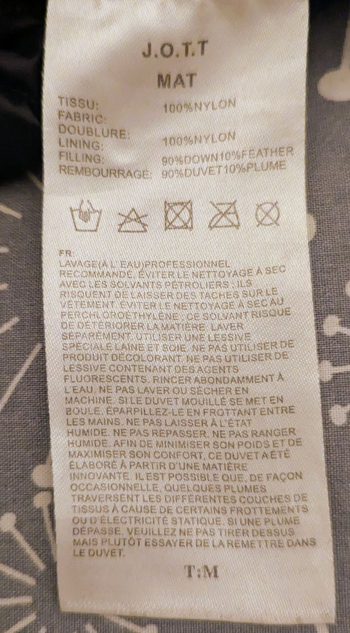 Doudoune légère JOTT modèle MAT, couleur bleu marine, taille M. Très chaude et confortable grâce à son garnissage 90% duvet / 10% plumes. Modèle idéal pour la mi-saison et l’hiver. ✔️ Coupe ajustée ✔️ Fermeture zippée ✔️ Logo JOTT sur la manche ✔️ Légère et compressible ✔️ Tissu 100% nylon 🔎 État : bon état général. ⚠️ Présence d’un petit accro au dos (voir photo). Défaut uniquement esthétique, la doudoune reste parfaitement portable et chaude. 📦 Envoi rapide et soigné