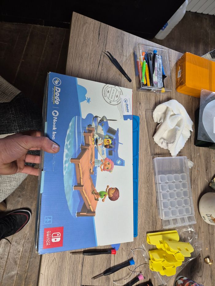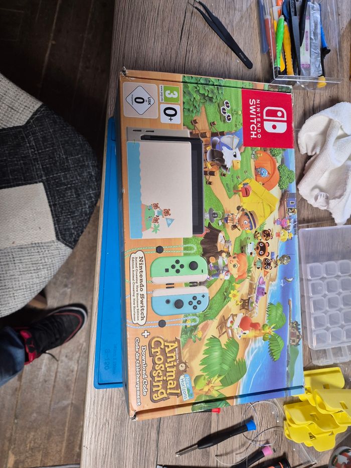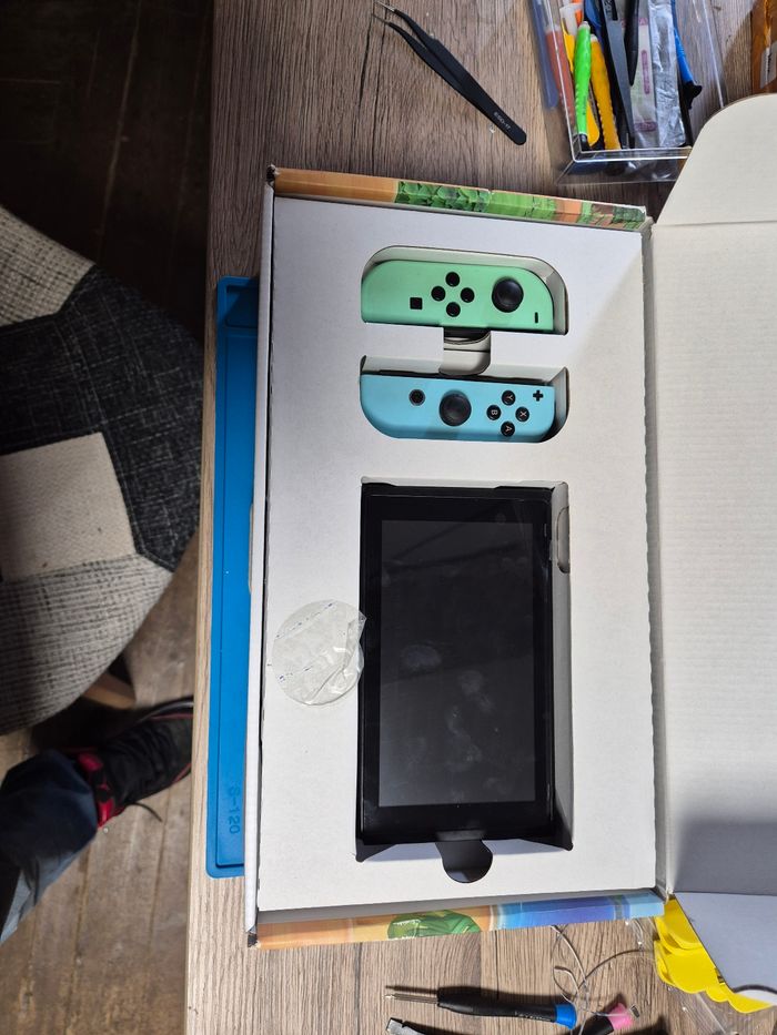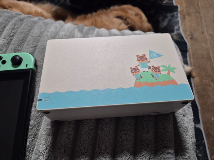 Bonjour vend switch édition limitée animal crossing écran tactile neuf je vient de le changer Joycon d'origine dragonne d'origine il y as avec la base et le chargeur Boite bon état Film a enlever sur ecran mais je le laisse pour la vente Très léger impact sur coque (voir derniere photos)