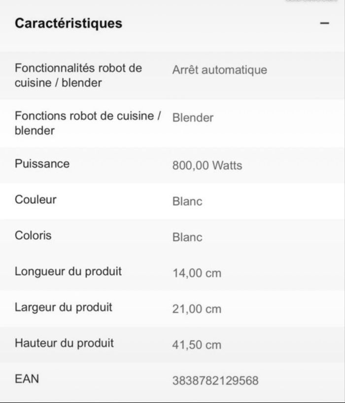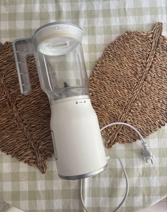 Bonjour, ⭐️ Je vends mon blender Gorenje blanc car double usage. Fonctionnalité: Lame en acier inoxydable à 4 pointesTranchant et durable La lame en acier inoxydable ne vous laisseras jamais tombé. La rotation rapide crée une action de mélange irrégulière qui, couplé avec le design Tritan du bocal, fait descendre les ingrédients et les mélange parfaitement. Commandes platesTrouvez votre vitesse idéale Les commandes à éffleurements sont située sur le boîtier et entourées d'une élégante lumière LED pour compléter le design de l'appareil. Utilisez-les pour choisir entre trois vitesses et la fonction d'impulsion à arrêt automatique. Spécifications: Marque: Gorenje Couleur: Blanc Capacité: 1500 Millilitres Tension: 230 Volts Référence constructeur: ‎731076 Puissance maximale du moteur: 800 W Dimensions produit (L x H x P): 21 × 41,5 × 14 cm Poids net: 2,4 kg