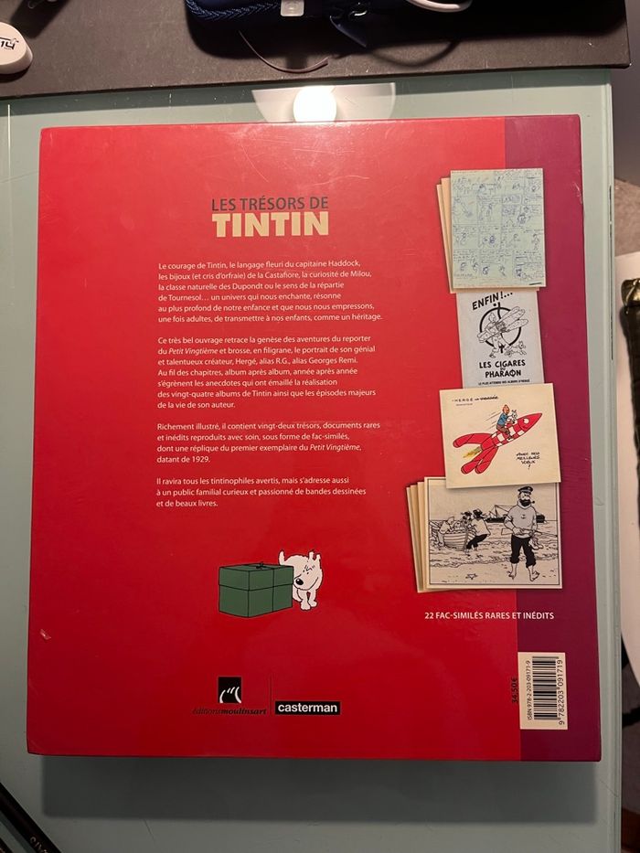 Sold out ! Introuvable en neuf Livre Moulinsart Tintin - Coffret sous blister : Les Trésors de Tintin Edition luxe sous coffret contenant un ouvrage de 96 pages et une pochette contenant 22 documents rares et inédits. Largeur: 28,5 cm environ Hauteur : 32,5 cm environ. Nombre de pages : 96 pages. Impression 4 couleurs sur papier couché mat 150 gr, et couverture cartonnée. Année de création : 2014. Tintin - Coffret : Les Trésors de Tintin Coffret Coffret, Paru le 5 novembre 2014, Bande dessinée Le courage de Tintin, le langage fleuri du capitaine Haddock, les bijoux (et cris d'orfraie) de la Castafiore, la curiosité de Milou, la classe naturelle des Dupondt ou le sens de la répartie de Tournesol... Un univers qui nous enchante, résonne au plus profond de notre enfance et que nous nous empressons, une fois adultes, de transmettre à nos enfants, comme un héritage. Ce très bel ouvrage retrace la genèse des aventures du reporter du Petit Vingtième et brosse, en filigrane, le portrait de son génial et talentueux créateur, Hergé, alias R.G., alias Georges Remi. Au fil des chapitres, album après album, année après année s'égrènent les anecdotes qui ont émaillé la réalisation des vingt-quatre albums de Tintin ainsi que les épisodes majeurs de la vie de son auteur. Richement illustré, il contient vingt-deux trésors, documents rares et inédits reproduits avec soin, sous forme de fac-similés, dont une réplique du premier exemplaire du Petit Vingtième, datant de 1929. Il ravira tous les tintinophiles avertis, mais s'adresse aussi à un public familial curieux et passionné de bandes dessinées et de beaux livres.