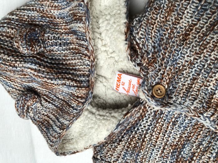 Veste à capuche / gilet Hema, Taille 62 cm = 3 mois, Manches longues, Hiver/ mi-saison, Chaude : extérieur en tricot et intérieur en moumoute sherpa, sauf l’intérieur des manches qui est en tissu glissant pour faciliter l’enfilage. De couleur crème, marron, bleu, Capuche avec des petites oreilles, Boutons effet bois. Mixte. En très bon état, sans trou ni tache. 🌸 Vous aimez cet article ? N’oubliez pas de visiter le reste de mon dressing en filtrant les tailles.