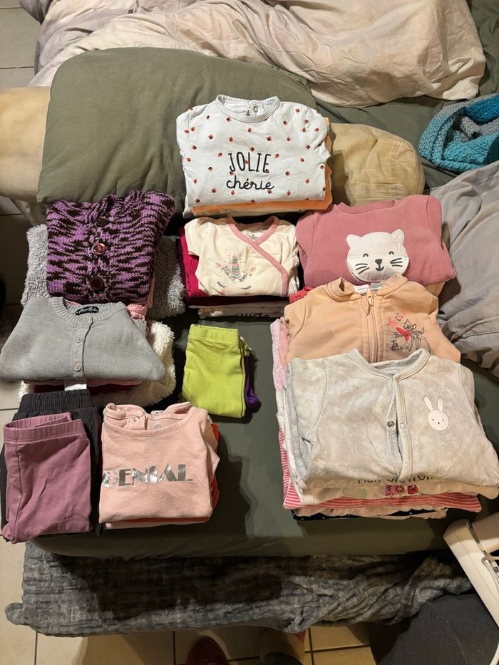 Lot vêtements fille 6 mois en très bon état y en a qui on était porté 1 fois d’autre jamais et d’autre quelque fois mais tous en bonne état 8 pantalons 2 Pantacourts 4 pyjamas léger 8 pyjama chauds 6 gilet léger 5 gilet chaud 1 ensemble 1 salopette manche courte 1 salopette manche longue avec capuche 5 pull chaud 6 bodys manche longue
