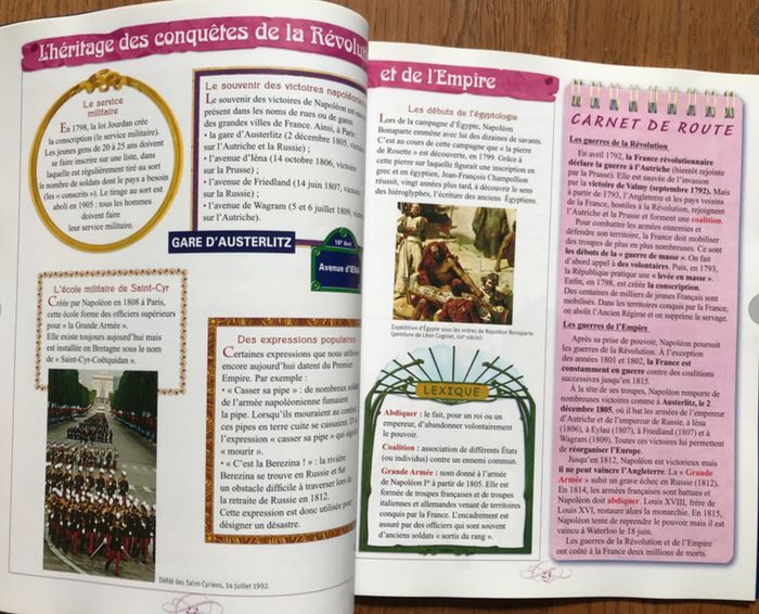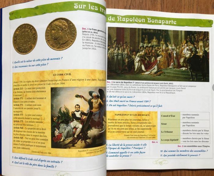 Très bon état 63 pages Grand format 23 x 28.5 cm Livre de l’élève CE2 - CM1 - CM2 Le dossier est découpé en plusieurs chapitres, pour présenter un personnage, traiter d'un aspect de la vie quotidienne ou d'un événement marquant de la période. Pour chaque chapitre, une approche originale, en 3 étapes : - une double page de présentation du personnage ou du thème, avec des repères dans l'espace et dans le temps (frise chronologique, cartes) et des documents pour commencer l'observation ; - une double page "Sur les traces de l'histoire", pour approfondir les événements marquants de l'époque ; - une double page "L'héritage de l'histoire", pour raconter à travers des récits, des photographies, des documents, ce qui nous reste aujourd'hui de cette période. «Un carnet de route » clôt le chapitre : il propose un résumé de la leçon. Les mots difficiles sont expliqués dans un lexique en marge du texte. Chaque double page est centrée sur l'étude de documents riches, variés et de grande taille. L'élève est placé en situation de recherche et construit progressivement son savoir à travers un questionnement sur les documents. Tous les 3 chapitres, une double page "A la manière de...", en lien avec les arts plastiques ou le français, permet aux enfants de découvrir de manière active des situations de l'époque concernée (en dessinant, jouant...). À la fin de l'ouvrage sont regroupés des cartes supplémentaires, une grande frise chronologique et un dictionnaire (reprenant les mots précédemment expliqués dans les différents lexiques).