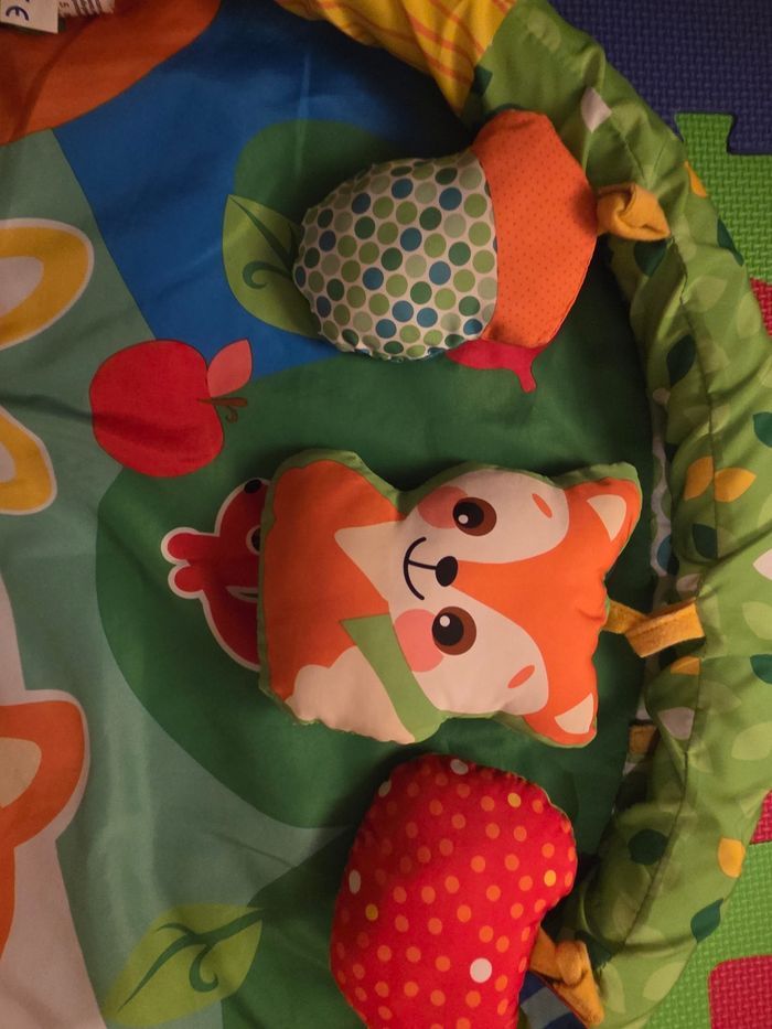 Superbe tapis d'éveil sur le thème des animaux de la forêt. En très bon état et complet. Son arche se détache afin de s'utiliser seule selon les besoins et les envies de bébé. Il pourra découvrir en tout sécurité. Les éléments tels que le gland, la pomme et le renard (qui fait du bruit) se scrathent sur d'autres supports pour sa plus grande joie. Tout est très propre. Dimensions: 80×60. Encore vendu neuf 30 Euros.