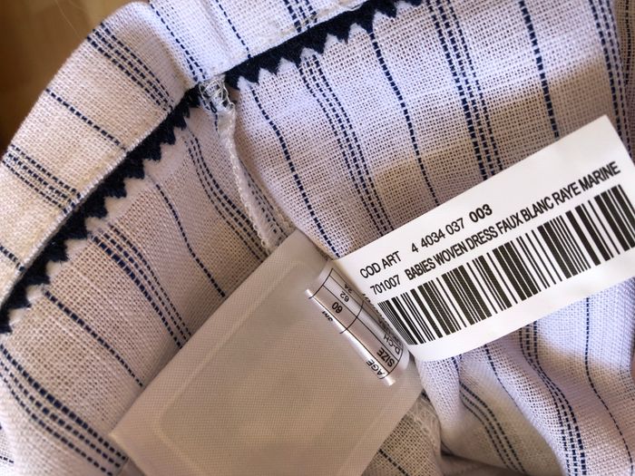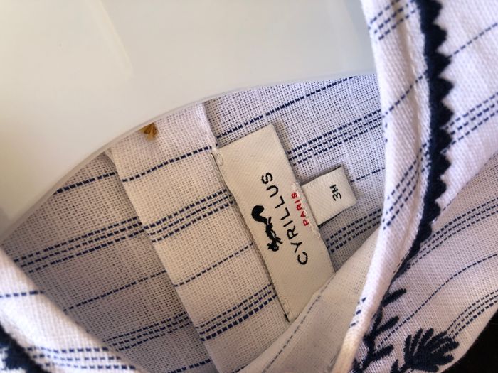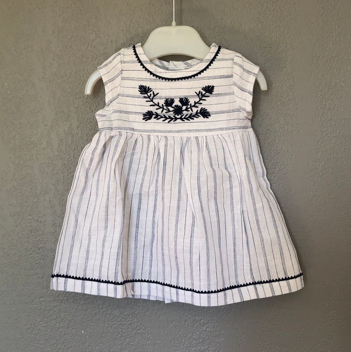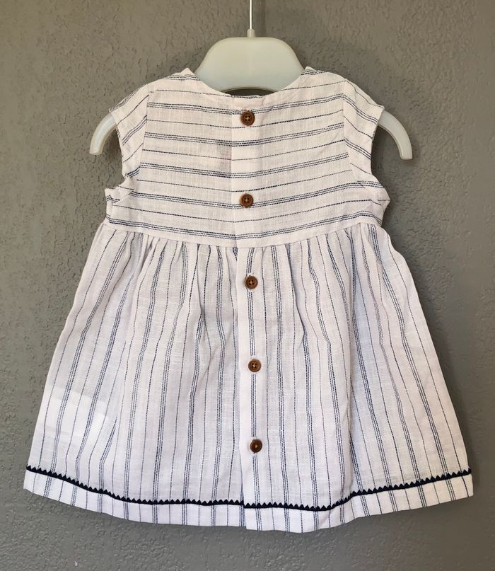Robe été Cyrillus, Taille 3 mois/ 60 cm, 100% coton, Mini manches. Magnifique robe en toile blanche avec de fines rayure bleu marine. Jolis détails et finitions: autour de l’encolure et en bas de la robe, broderies de fleurs sur l’avant. S’ouvre intégralement avec des boutons en bois, tout le long du dos. Neuve jamais mise, jamais lavée. Le tissu est encore raide. Il y a un bouton de rechange disponible si besoin. 🌸 Vous aimez cet article ? N’oubliez pas de visiter le reste de mon dressing en filtrant les tailles.