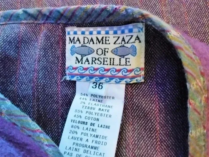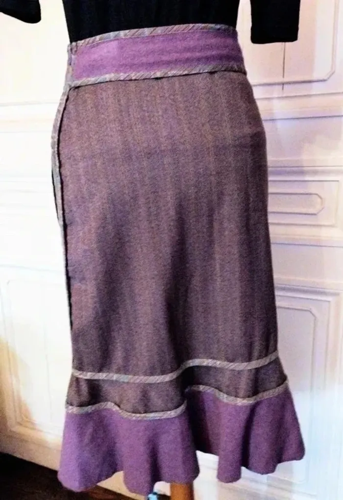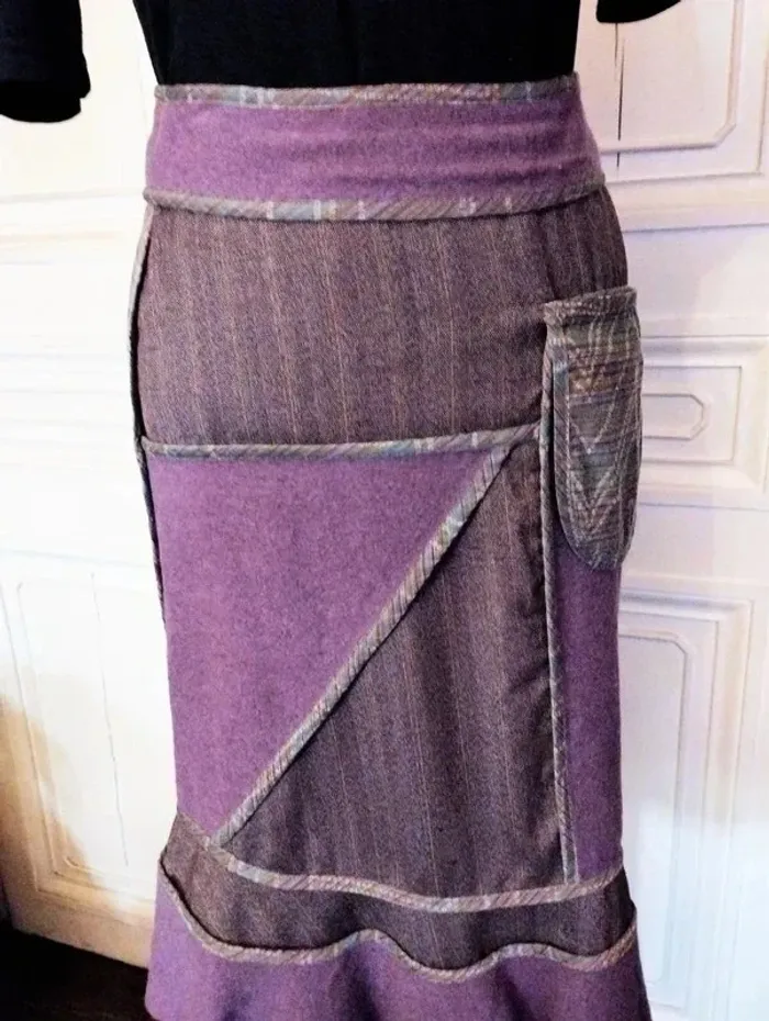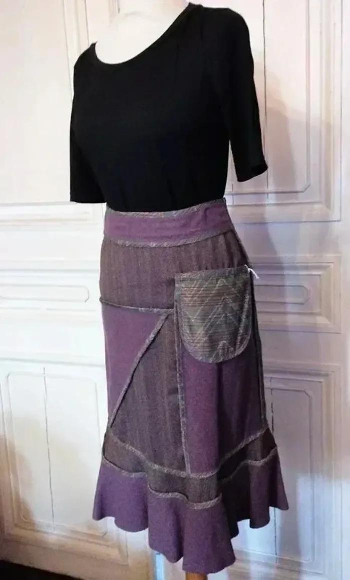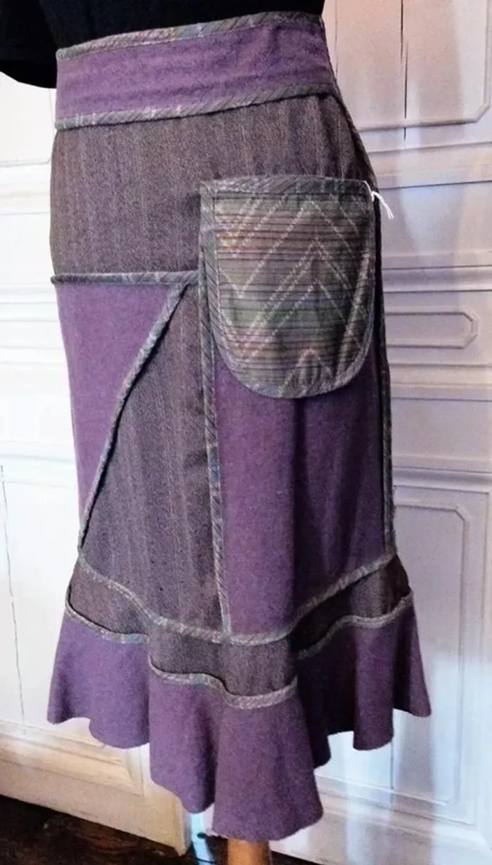 MADAME ZAZA OF MARSEILLE JUPE 36 CORRESPOND A UN 34- 36 VOIR MESURES AU BAS MODELE BIEN CHAUD CONFORTABLE EXTENSIBLE TRES ORIGINALE ET FEMININE FIDELE A L ESPRIT DE LA CREATRICE BIMATIERE LAINE ET VELOURS DE LAINE MONTEE SUR CEINTURE EMPIECEMENT BANDEAU VELOURS DE LAINE PRUNE ATTACHée LE LONG DE LA FERMETURE GAUCHE HAUTEUR 6.5 CM AVEC REBORDS GALON SATIN MAUVE ET CERISE ON RETROUVE CE GALON DE SATIN MAUVE STRIé DE BANDES CERISE ET DE PETITS CARRés ROSE SUR TOUTE LA JUPE DELIMITANT LES EMPIECEMENTS ET SUIVANT LA LIGNE DE LA JUPE SUR LES 2 COTés CORPS DE LA JUPE EN DRAP DE LAINE IMPRIMé BORSALINO PRUNE MOUCHETé AVEC LIGNES CERISE SOUS LA TAILLE DROITE EMPIECEMENT LAINE PRUNE TRIANGULAIRE DE 27 CM SUR 26 SOUS LA TAILLE GAUCHE EMPIECEMENT LAINE PRUNE RECTANGULAIRE DE 36 CM SUR 22 SURMONTé D UNE POCHE ANSE PLATE SEMI FLOTTANTE EN SATIN MAUVE 16 CM SUR 14 AU BAS GRAND VOLANT DANSANT TRéS ONDULé EN LAINE PRUNE HAUTEUR 13 CM FERMETURE ZIP INVISIBLE HANCHE GAUCHE 22 CM AVEC ATTACHE GOUTTE D EAU PRUNE ETIQUETTE INTERNE MADAME ZAZA OF MARSEILLE AVEC PETITS POISSONS TAILLE 35 CM HANCHES 44 CM BAS 97 CM LONGUEUR 66 CM