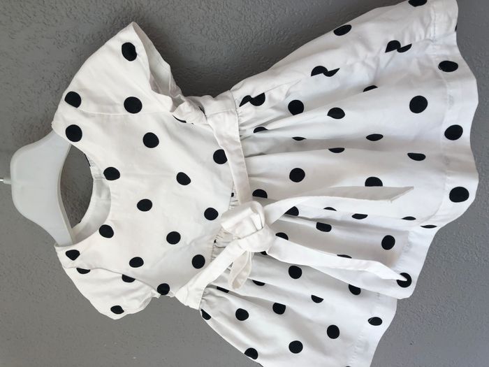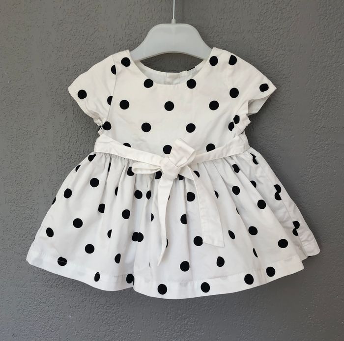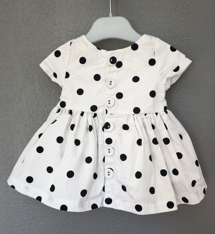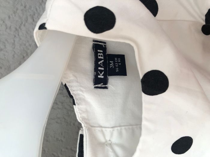 Robe été Kiabi, Taille 3 mois/ 56-62 cm, 100% coton, Entièrement doublée, avec un petit volant en tulle sous le jupon, pour donner plus de volume. Manches courtes. Blanche avec de gros pois noirs. Ceinture qui se noue à la taille. Très mignonne et très élégante cette petite robe pour la vie de tous les jours ou pour une cérémonie. Ouverture tout le long du dos avec des gros boutons recouverts du même tissu que la robe. En excellent état, ni trou, ni tache. 🌸 Vous aimez cet article ? N’oubliez pas de visiter le reste de mon dressing en filtrant les tailles.