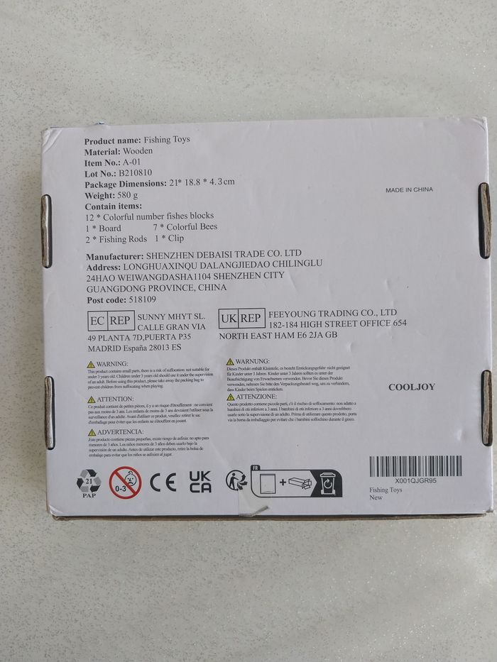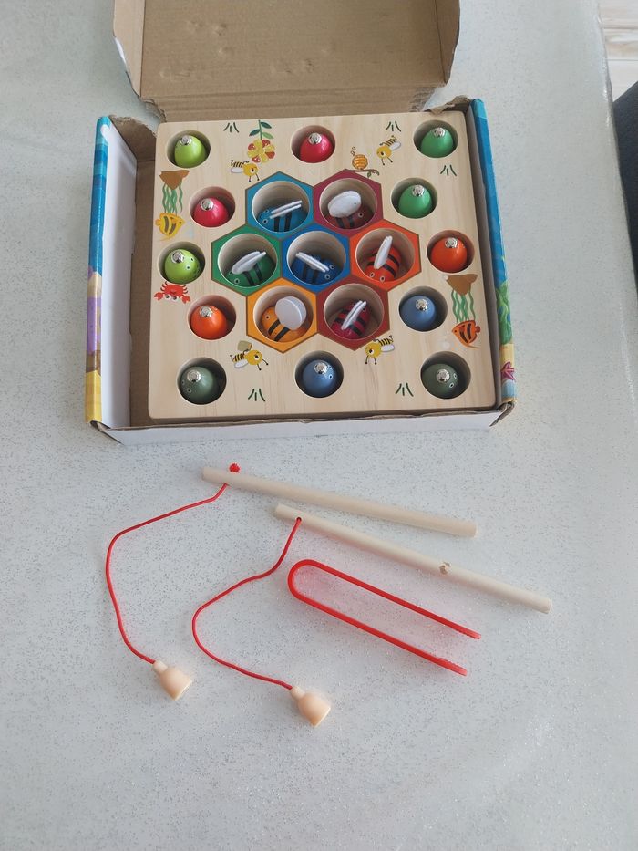 Jeu en bois amusant pour enfant qui permet de développer la motricité en attrapant des poissons à l'aide d'un aimant ou des abeilles avec une pince. Possibilité de jouer plusieurs, jeu adapté pour les petits à partir de 3 ans. Le jeu est complet, avec la notice, utilisé plusieurs fois mais il est resté en parfait état, la boîte par contre est un peu abîmée (voir photos 4 et 5).