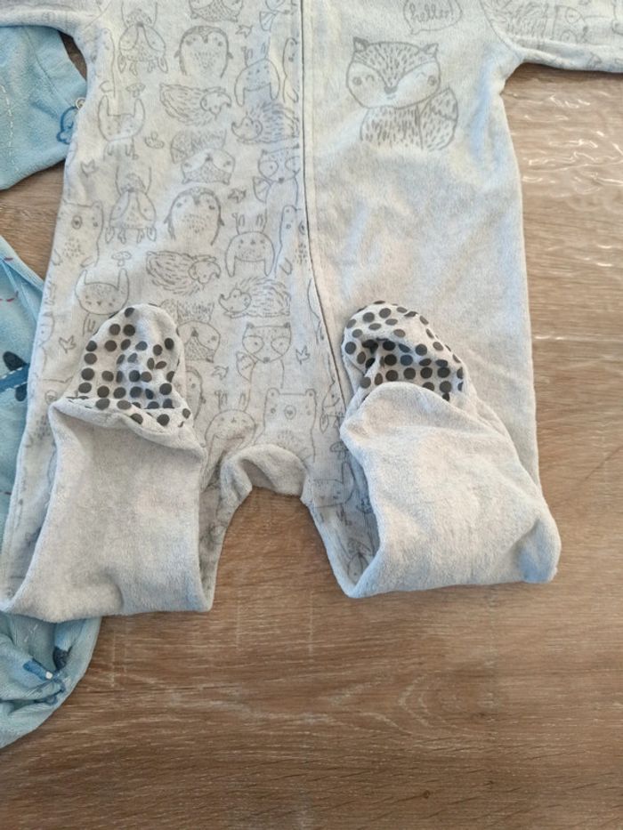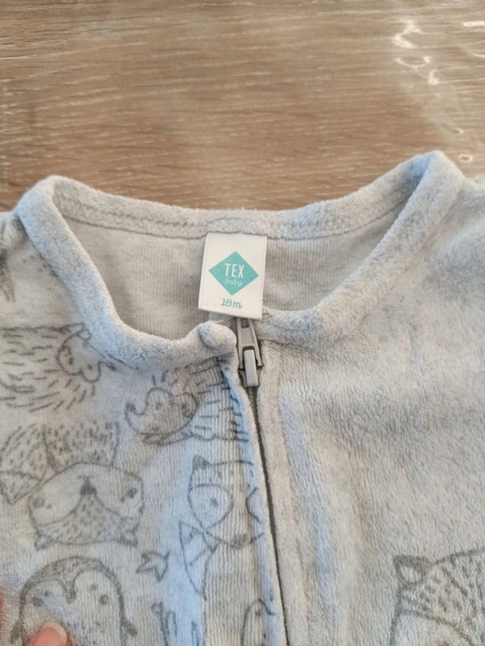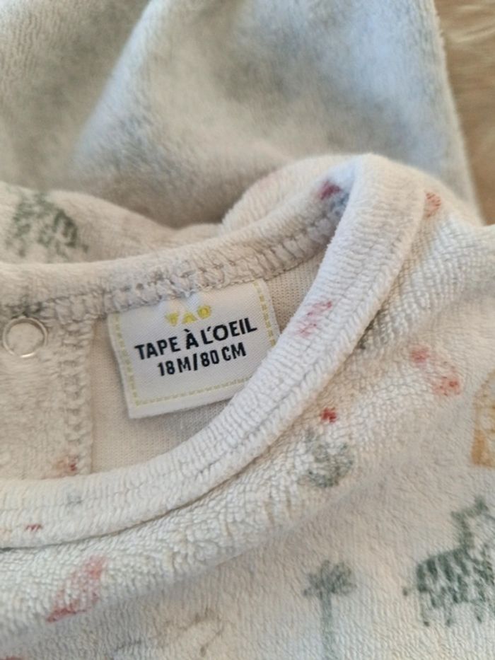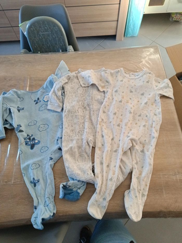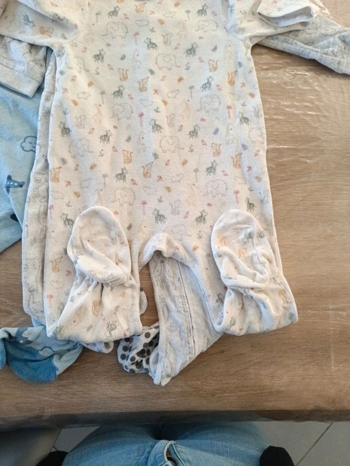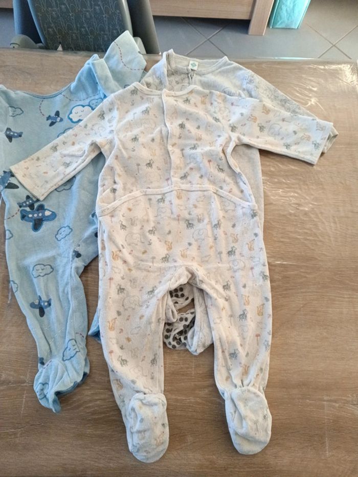 Lot de 3 pyjamas une pièce garçon Taille 18 mois Le bleu à nuage orchestra Le gris ouverture devant tex baby Les animaux éléphants girafe...tape à l'oeil Tous en très bon état, juste le gris les petits tampons antidérapant des pieds qui partent. #laeti1059_18mois