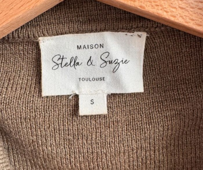 💥 Pièce iconique ! Véritable gilet en maille Maison Stella & Suzie, modèle à l'esprit "saharienne" chic, taille S. Couleur vert olive / kaki, une teinte intemporelle et élégante. 💎 Détails complets : Coupe : Style veste boutonnée avec col chemise et emmanchures travaillées. Détails : Boutons bijoux dorés travaillés avec relief (style blason). Praticité : Deux poches poitrine à rabats boutonnés pour une allure structurée. Matière : Maille dense de haute qualité, offrant une excellente tenue et un toucher très doux. Fabrication : Design par la célèbre marque toulousaine, reconnue pour ses coupes féminines et ses finitions soignées. État : Très bon état, maille impeccable, boutons bien fixés et couleur éclatante. 📦 Envoi rapide et soigné