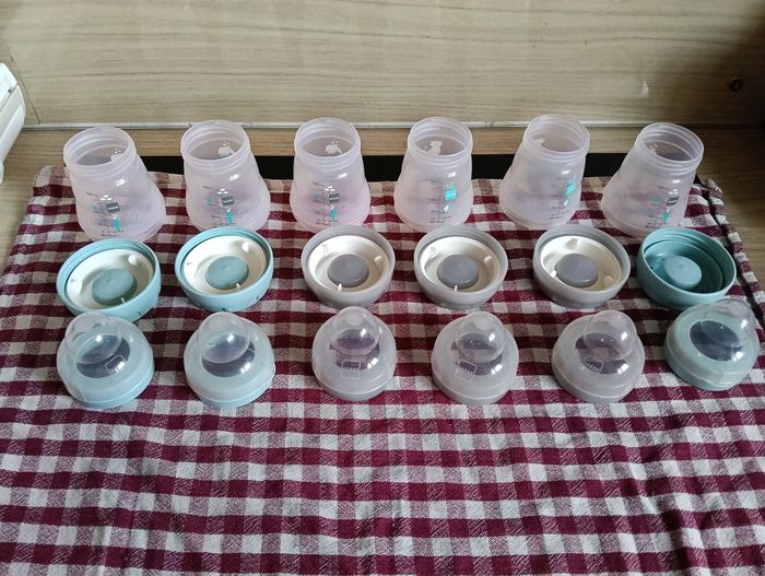 Très bon état Vendu sans les tétines Un des biberons est vendu sans le joint, les autres sont complets, voir photo