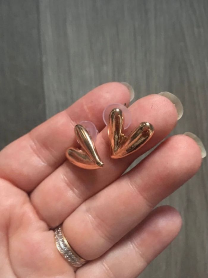 COMPTE PROPOSANT RÉDUCTIONS 💶😀 Petites boucles d’oreilles pour femme, en forme de cœurs 💛. Pour oreilles percées. Couleur : Doré TRÈS LÉGÈRES ✨NEUVES. Jamais portées.✨ Prix : 3€45 Je dépose DANS LA MESURE DU POSSIBLE les colis 📦 le jour même ou lendemain du paiement. 😉 MAIS SI CEST UN ENVOI URGENT, MERCI DE ME LE PRÉCISER ☺️. N’hésitez pas à jeter un coup d’👀 à mes évaluations. 🙂