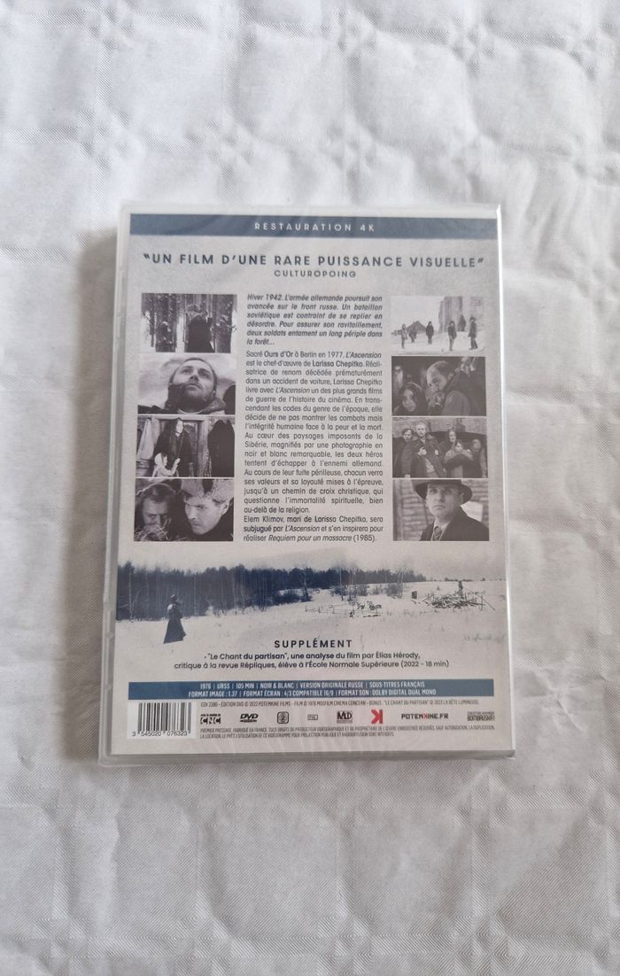 ​Bonjour ! Ce DVD du chef-d'œuvre de Larissa Chepitko est un basique efficace pour tout cinéphile averti. Une pièce puissante et rare, ici proposée dans une superbe restauration 4K pour une immersion visuelle totale. ​Fiche technique ​Style : Drame / Guerre / Cinéma d'auteur ​Coupe/Usage : DVD / Film (Restauration 4K) ​État ​L'article est en très bon état. Le DVD n'a jamais été utilisé et n'a jamais été sorti de sa boîte. Le boîtier est encore sous son blister d'origine scellé, garantissant une conservation parfaite du support. ​#lascension #larissachepitko #cinema #chefdoeuvre #4k #potemkine #film #war #collector #dvd #sovietcinema #banger
