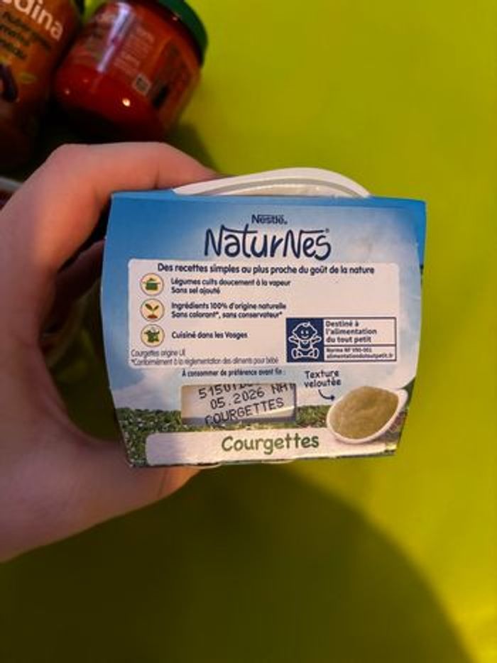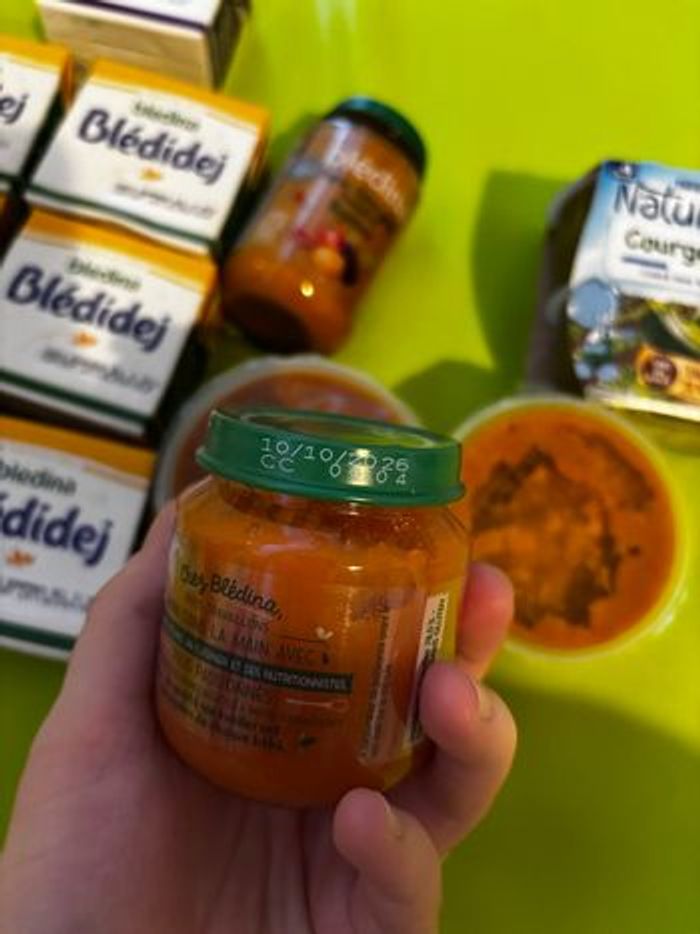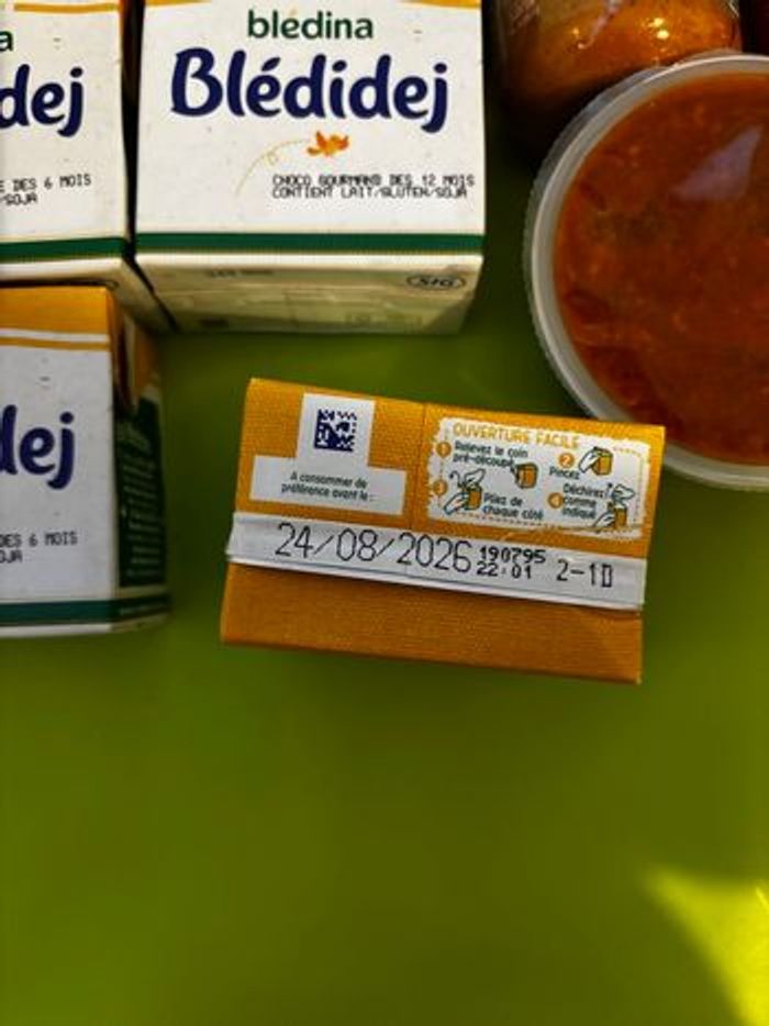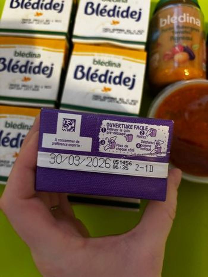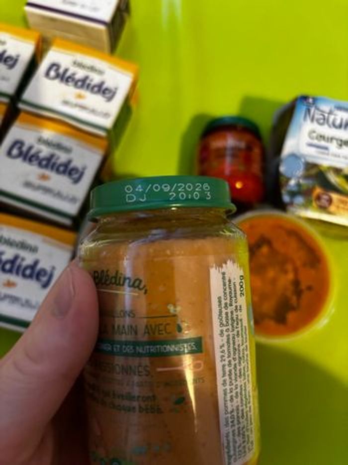 Lot de 6 blédidej, 3 saveurs choco gourmand et 3 vanille bon jusqu’à août 2026. 1 blédiner épinard bon jusqu’à mars 2026. Pack de petit pot courgettes mai 2026 1 pot purée aubergine tomates agneau jusqu’à septembre 2026. 1 pot carotte jusqu’à octobre 2026 1 pot good goût tomate aubergine bœuf bio jusqu’à juillet 2026