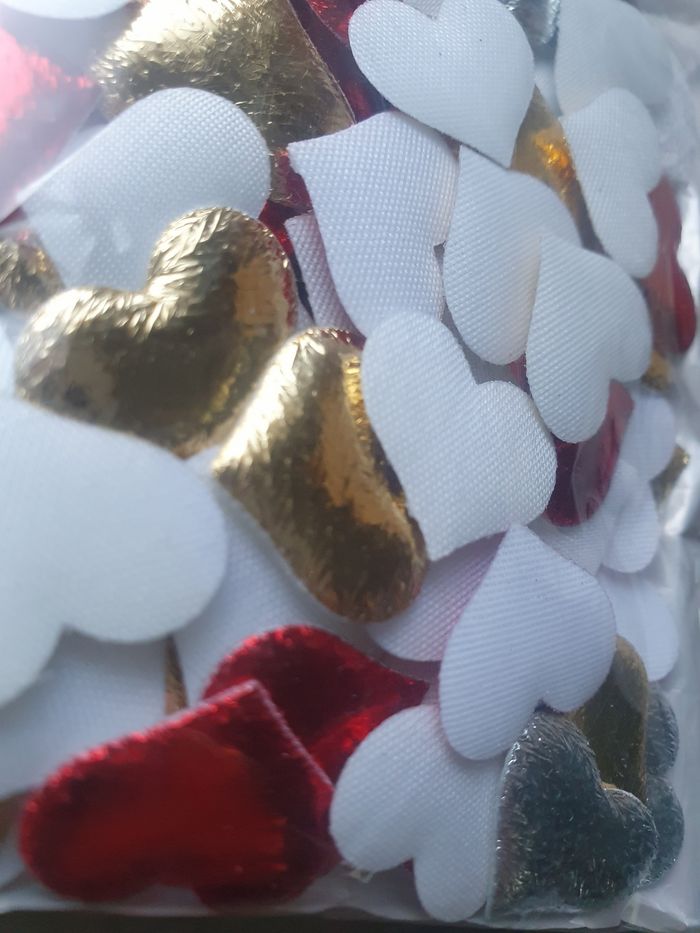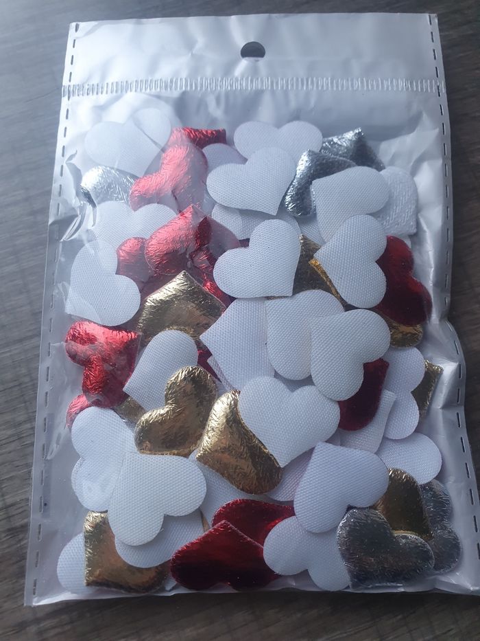 100 petits cœurs ❤️d environ 2cm. Couleur rouge, doré, argenté. Un côté plat et un côté bombé. Pour scrapbooking ou activites créatives
