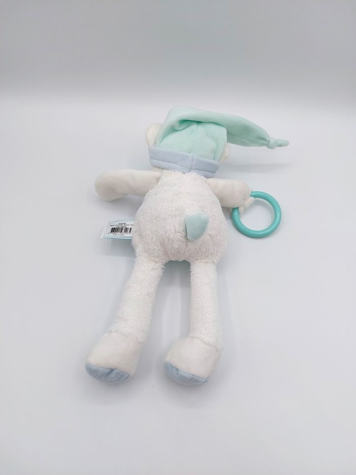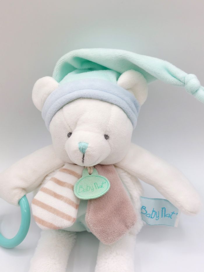 Doudou peluche ours blanc d’activités pouet BABY NAT layette BN0106 bleu vert 27 cm