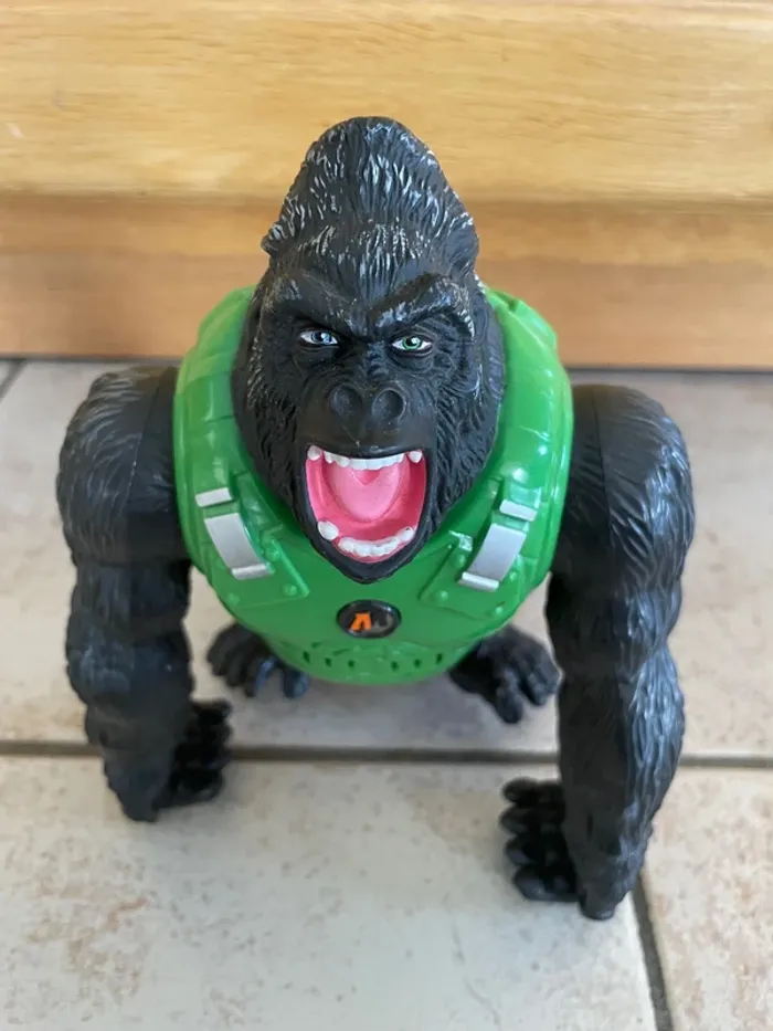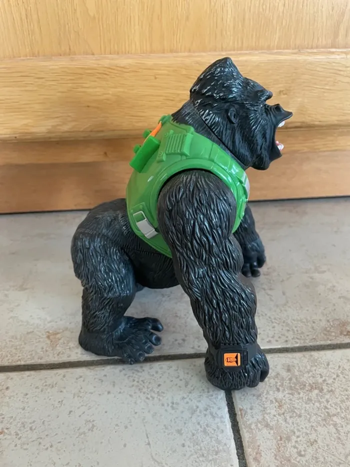 Gorille articulé Action Man (jouet vintage 2003/2004) Avec piles incluses (le jouet est sonore) Vendu tel que sur les photos (apparemment il devait y avoir des petites flèches oranges dans le dos? je ne les ai jamais eu..) Jouet assez lourd.