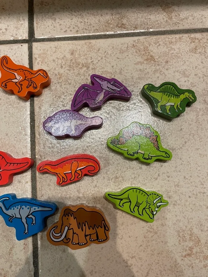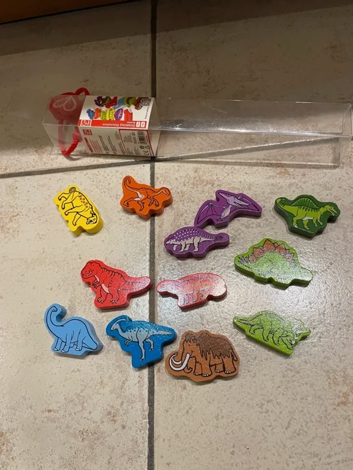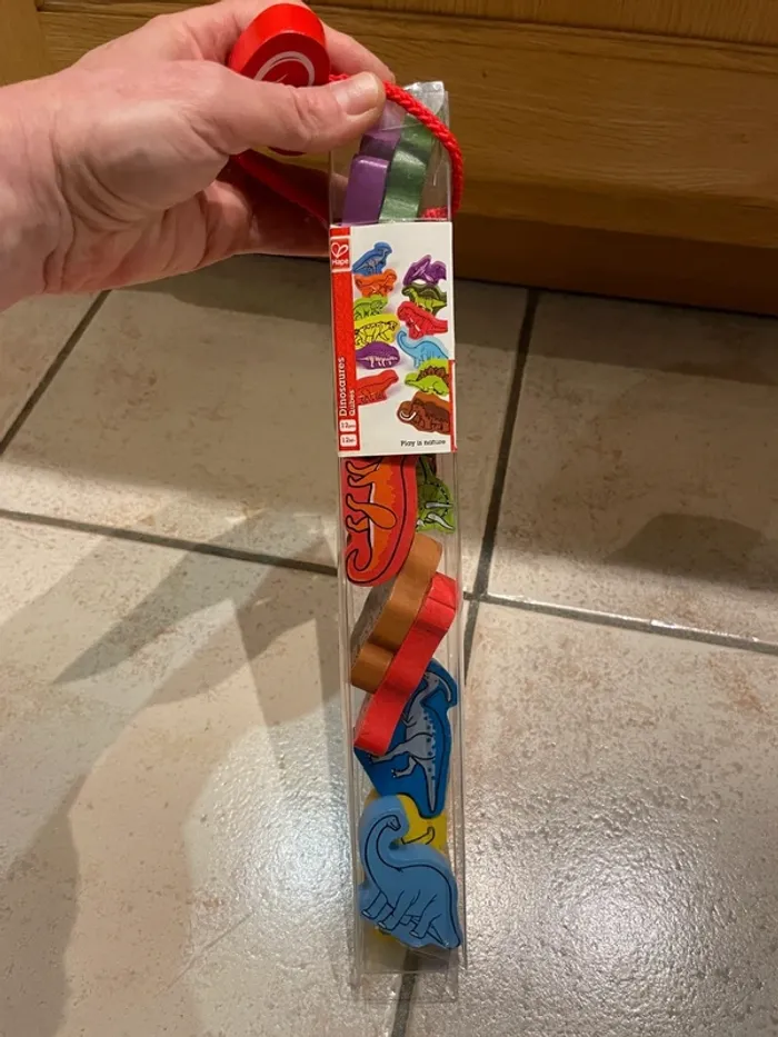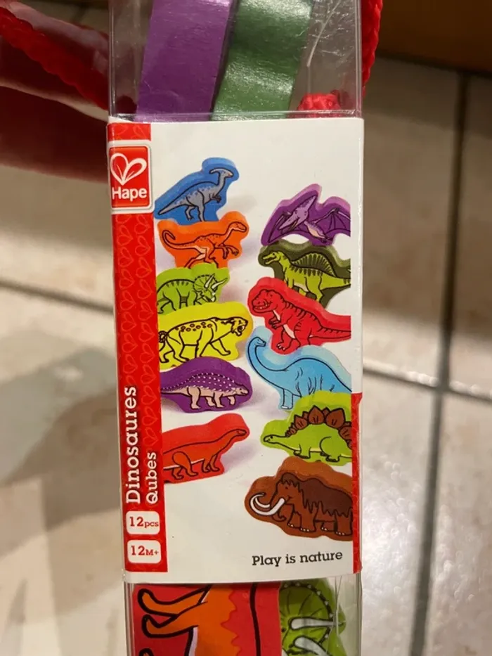 12 blocs de dinosaures en bois qui se rangent dans un tube Marque Hape Modèle "dinosaures qubes" A partir de 12 mois