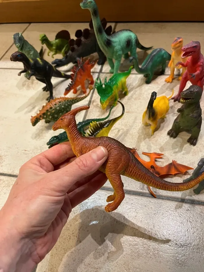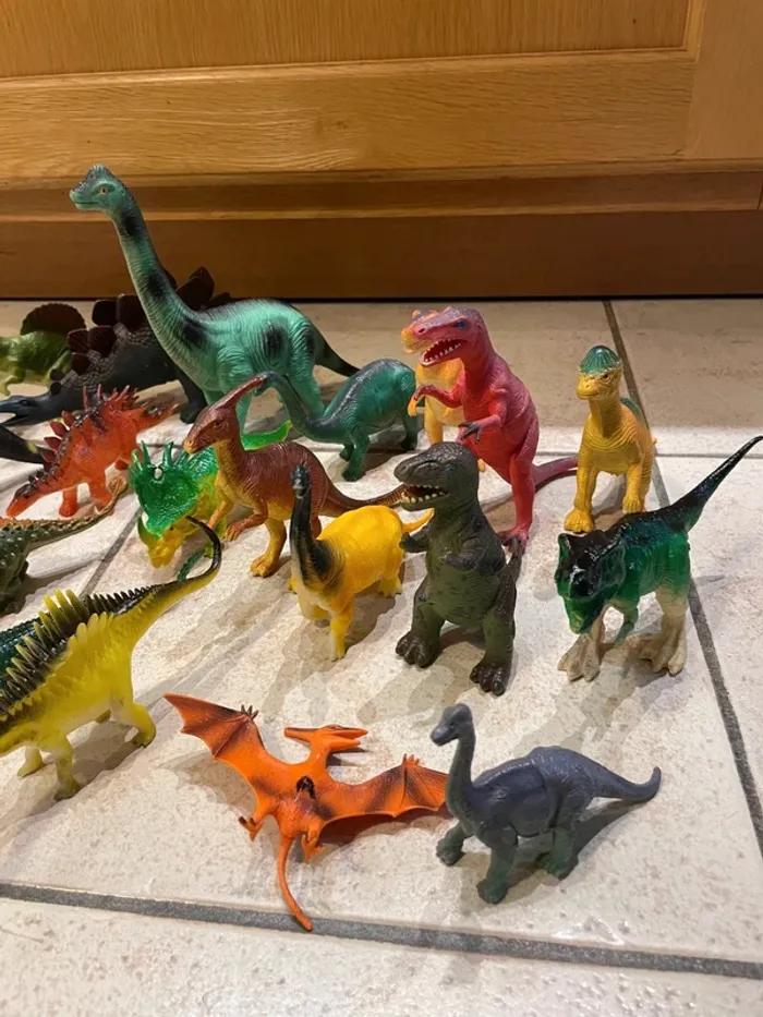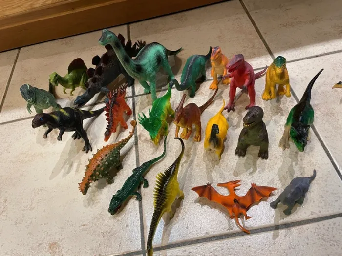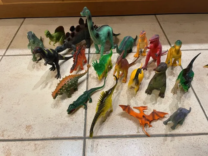 Lot de figurines dinosaures en plastique, en taille moyenne à grosse (voir la photo par rapport à ma main) Tout est sur les photos. J'ai un autre lot de petits dinosaures.