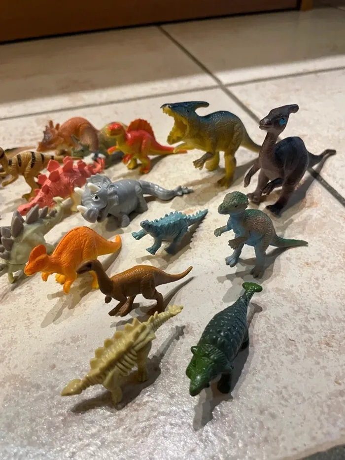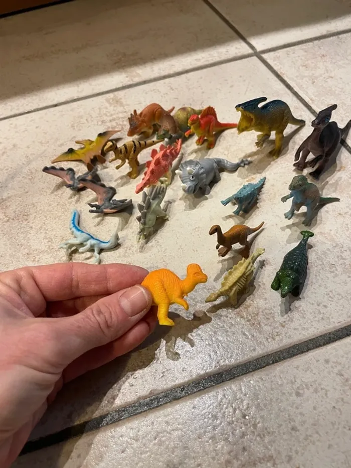 Lot de figurines dinosaures en plastique, petite taille (voir la photo par rapport à ma main) Tout est sur les photos. J'ai un autre lot de dinosaures plus grands.
