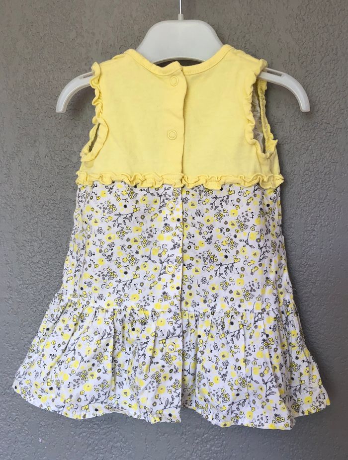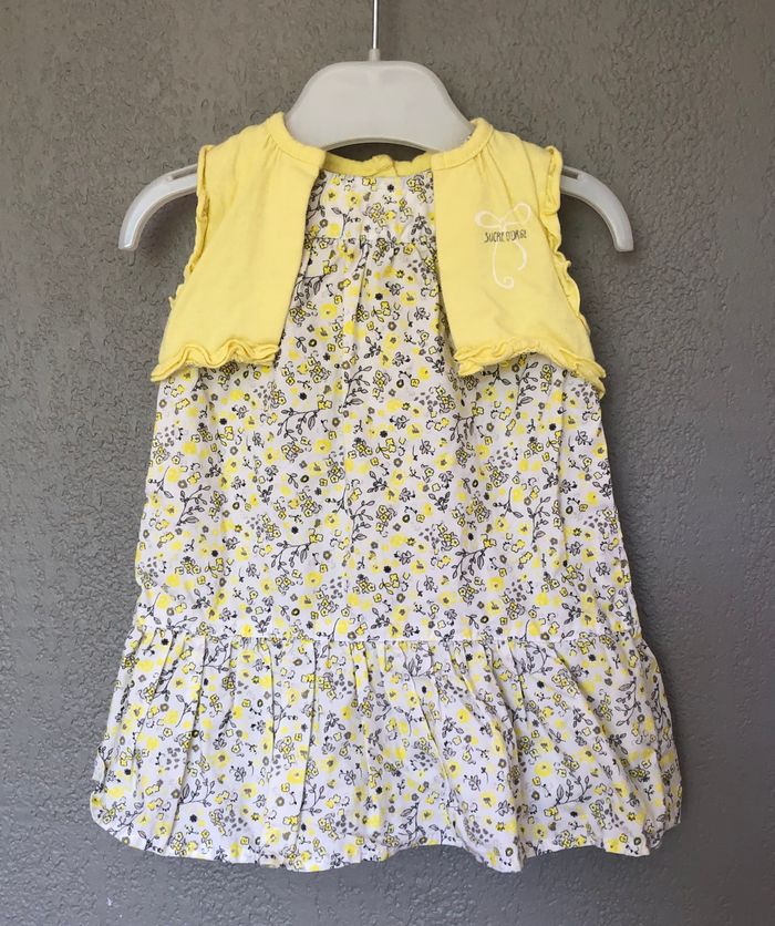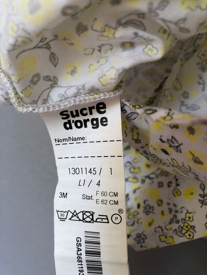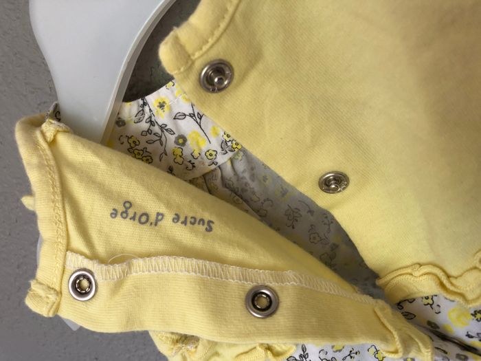 Robe été Sucre d’Orge, Taille 3 mois/ 60 cm, Sans manches, 100% coton. Robe bi-matière blanche avec des petites fleurs jaune pastel et grises. Effet 2en1, comme si la robe était recouverte d’un gilet. Ouverture tout le long du dos avec des pressions. Comme neuve, aucune imperfection. 🌸 Vous aimez cet article ? N’oubliez pas de visiter le reste de mon dressing en filtrant les tailles.