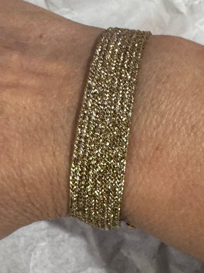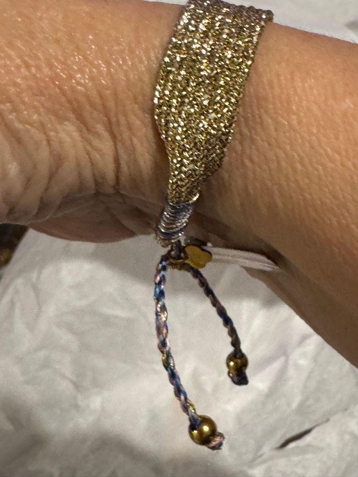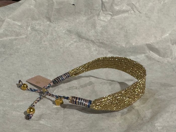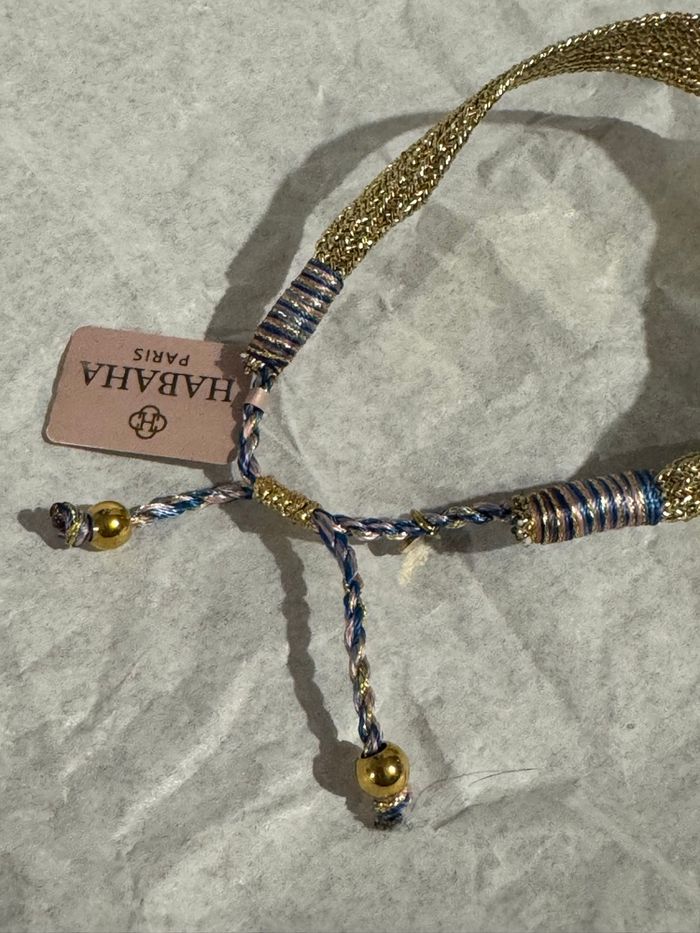 Magnifique bracelet manchette fils tissés or réglable par glissières et fils tresses bleus et roses Marque habaha Paris Neuf dans Pochon